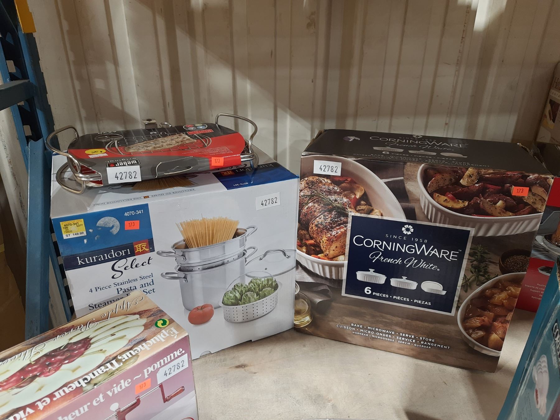 CORNINGWARE SET, CORELLE DISHWARE SET, SERTA DOUBLE SHEET SET, APPLE PEELER, 4 PCS STAINLESS STEEL PASTA POT SET, & GRILL BASKET
