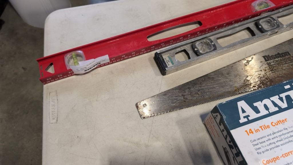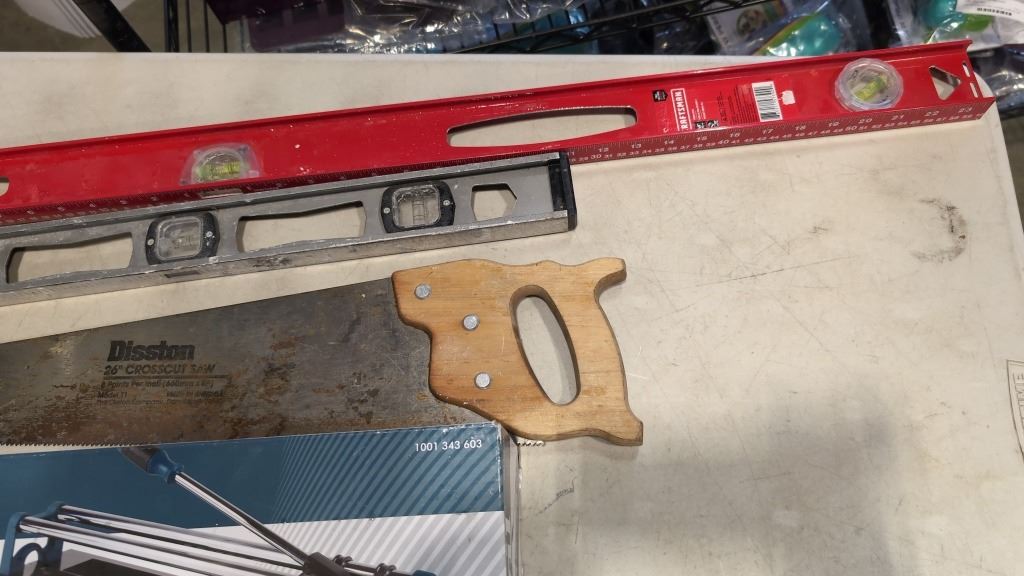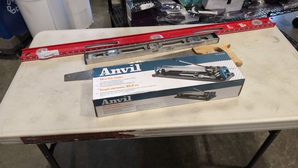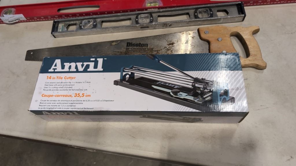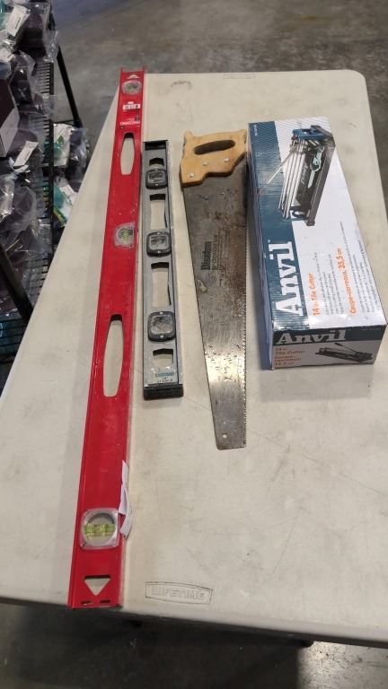 CRAFTSMAN AND MASTERCRAFT LEVELS, HAND SAW AND ANVIL 14 INCH TILE CUTTER