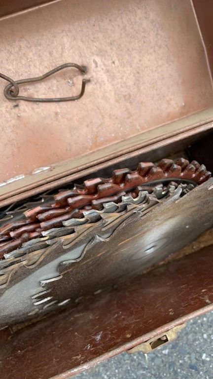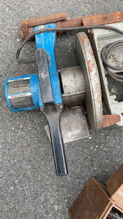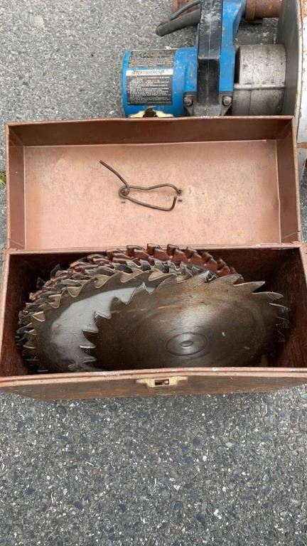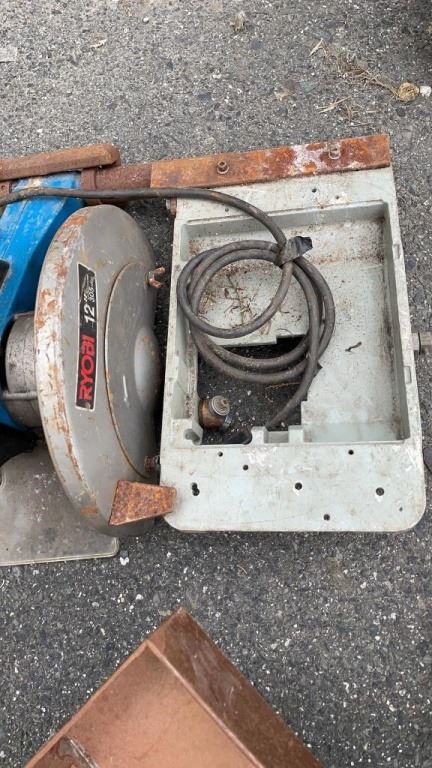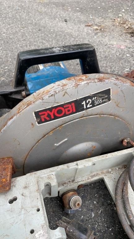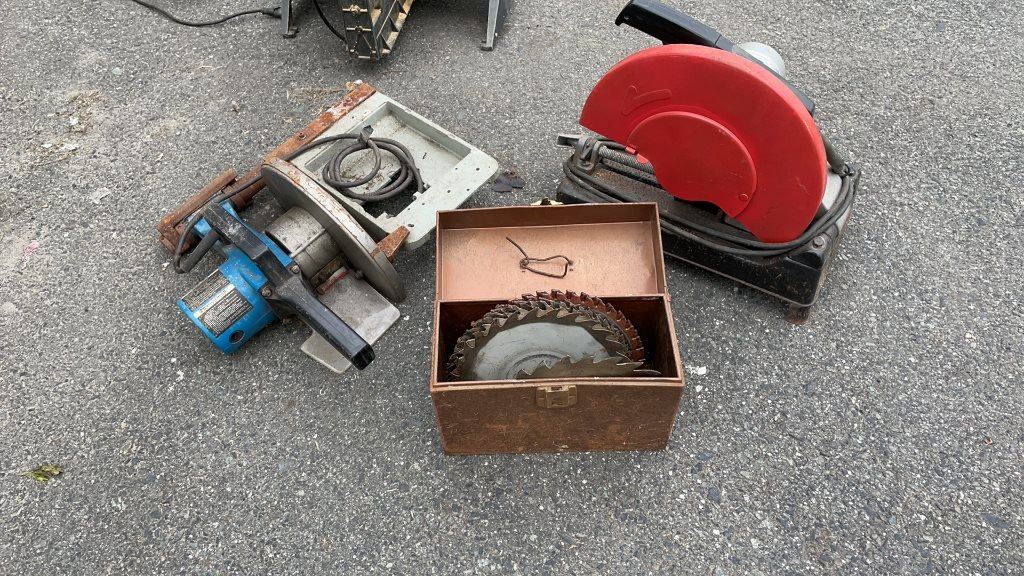 CRAFTSMAN MITER SAW, MAKITA CUTOFF SAW WITH RYOBI GUIDE SAW AND METAL CASE OF CICULAR SAW BLADES