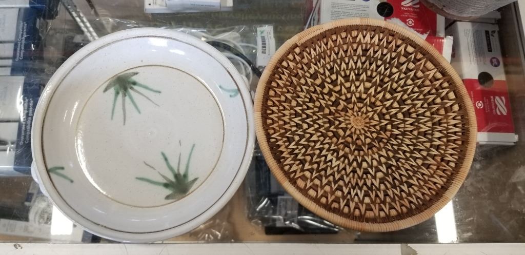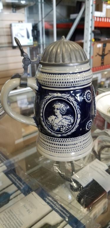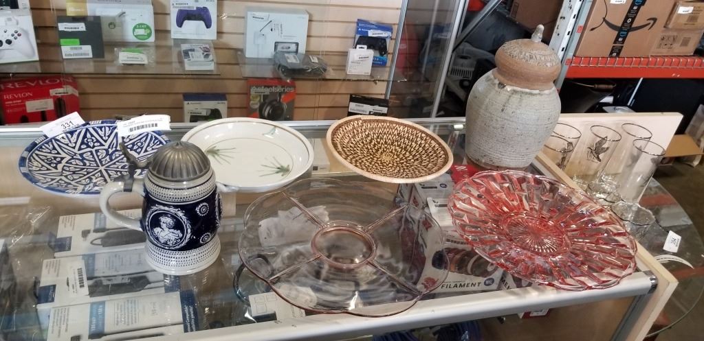 CRANBERRY GLASS AND OTHER PLATTERS, GERMAN STEIN, AND LIDDED VASE