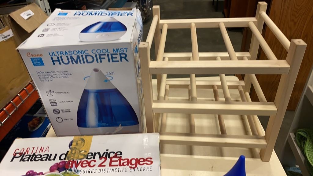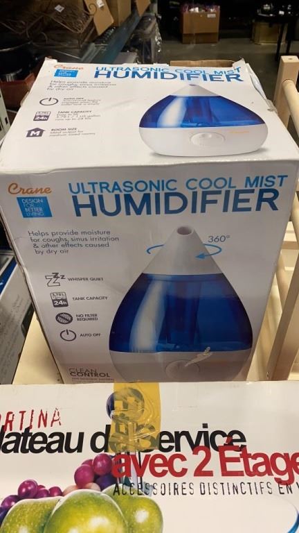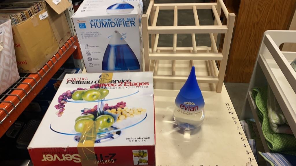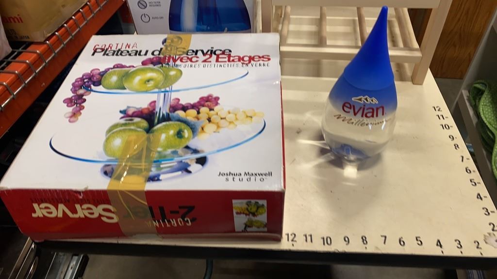 CRANE HUMIDIFIER, 2 TIER GLASS SERVER AND EVIAN MILLENIUM WATER