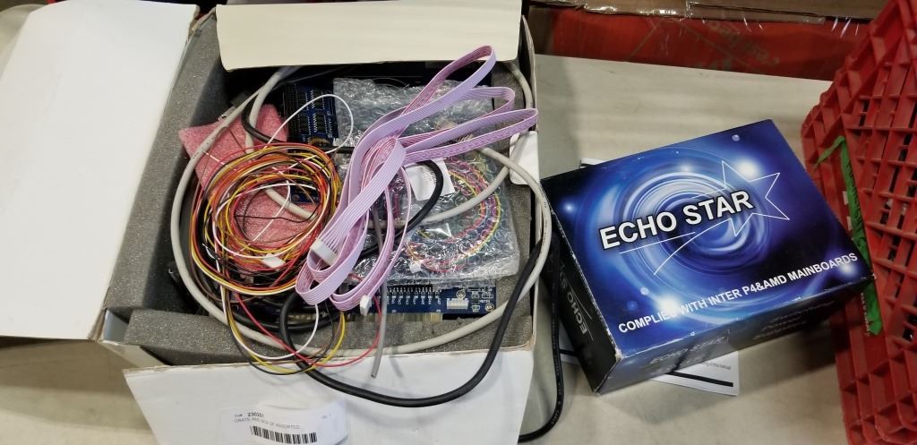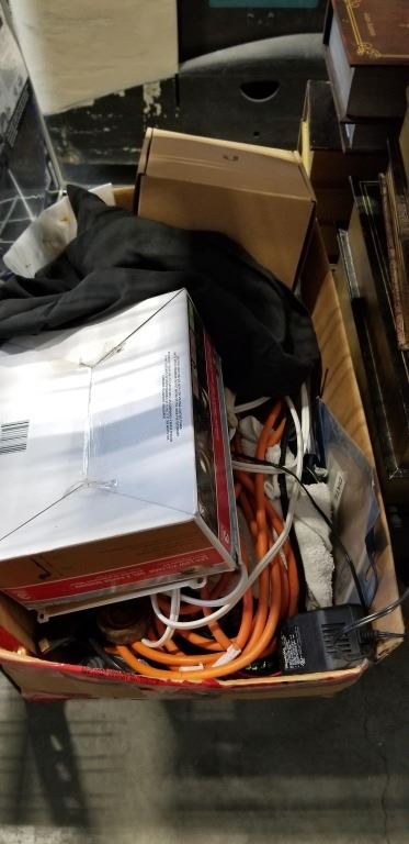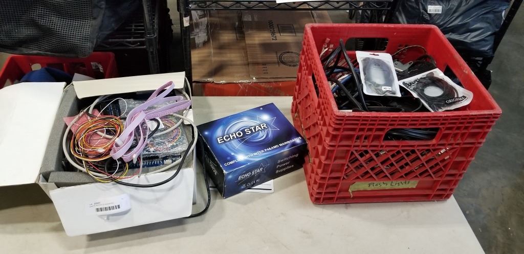 CRATE AND BOX OF ASSORTED ELECTRONICS, CABLES ETC.
