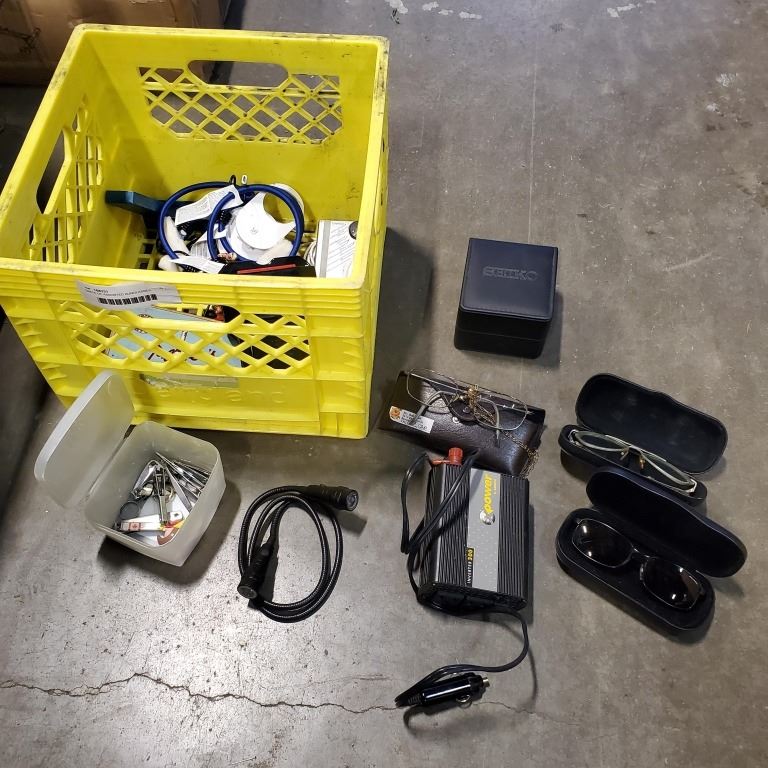 CRATE OF ASSORTED SUNGLASSES, XANTREX INVERTER, VINTAGE VIEWMASTRER (CRACKED) AND MORE