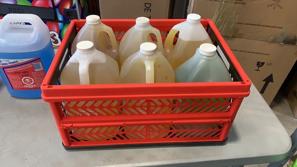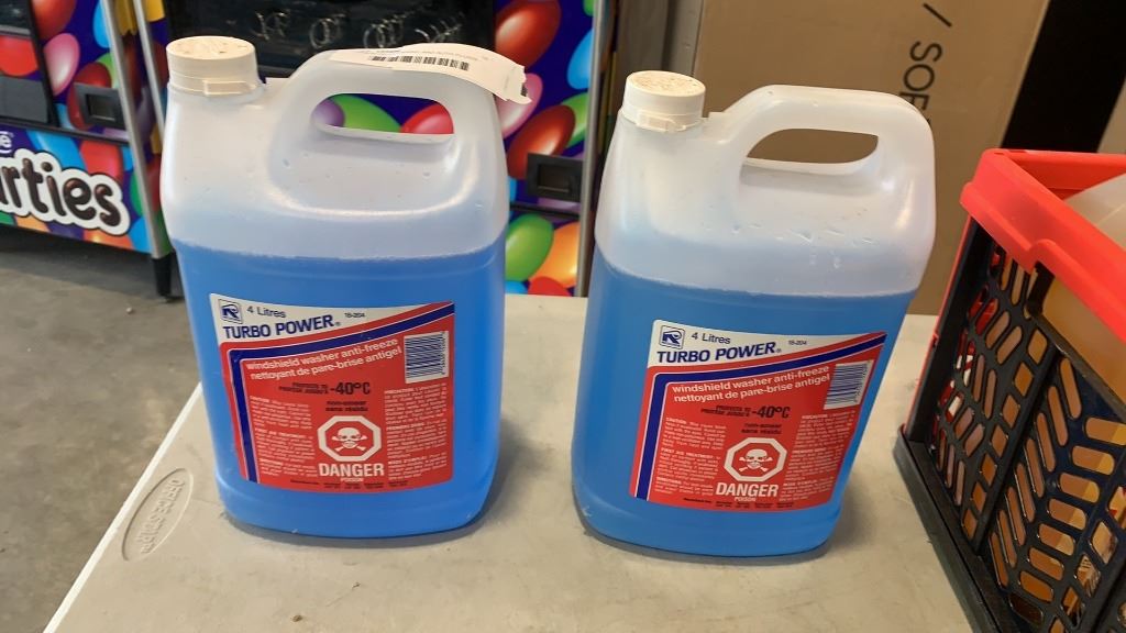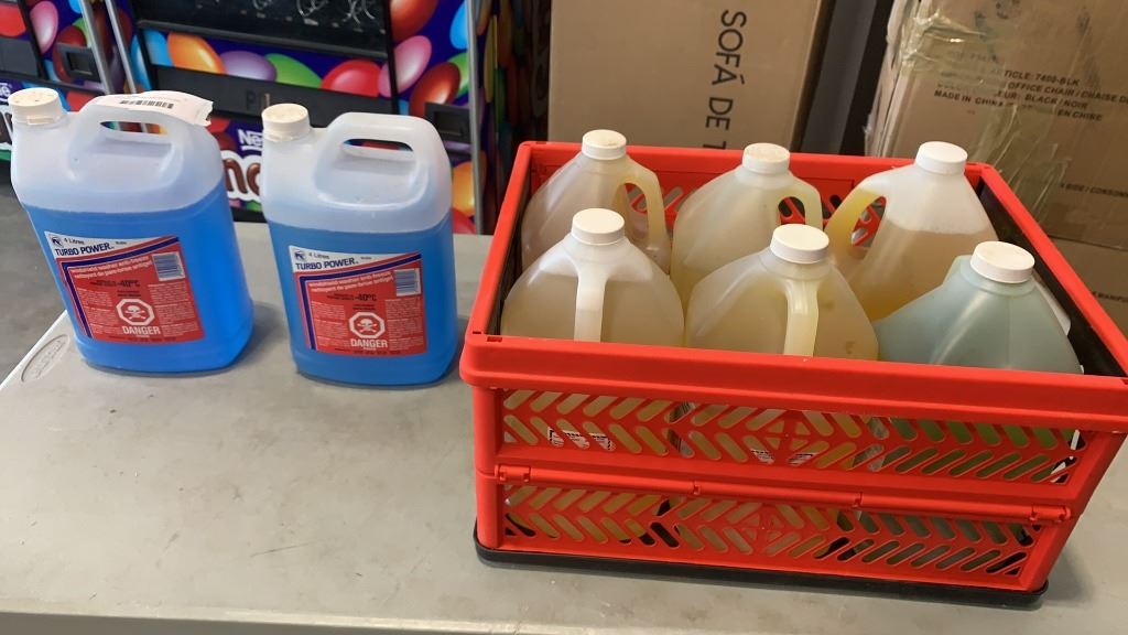 CRATE OF CLEANING AND AUTO FLUIDS - WINDSHIELD WASHER ANTIFREEZE, CAR WASH, WHITEWALL CLEANER AND ALL PURPOSE CLEANER/DEGREASER