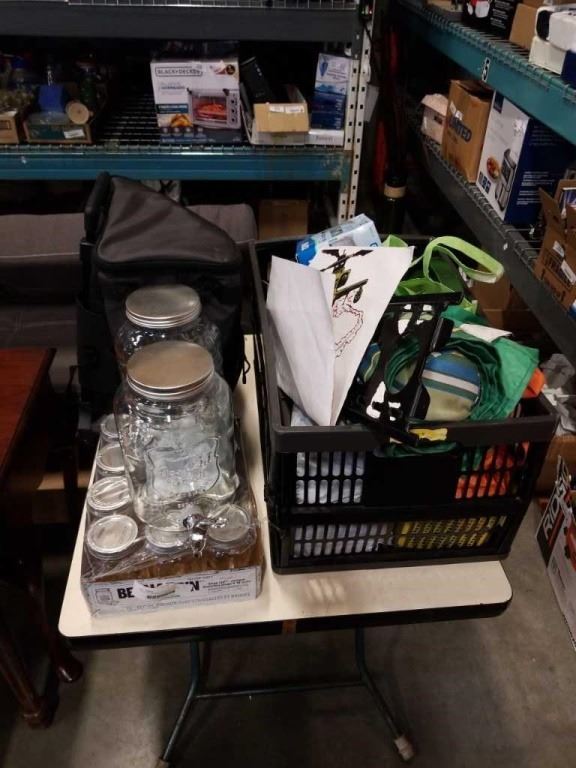 CRATE OF GARDEN HOSE REEL, BEACH MAT, COOLER BAG, MASON JARS AND GLASS DRINK DISPENSERS