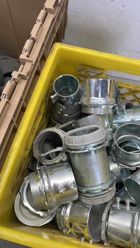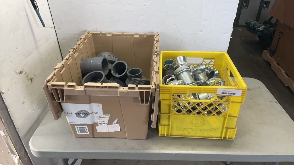 CRATE OF METAL HOSE FITTINGS AND TOTE OF PVC FITTINGS