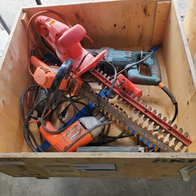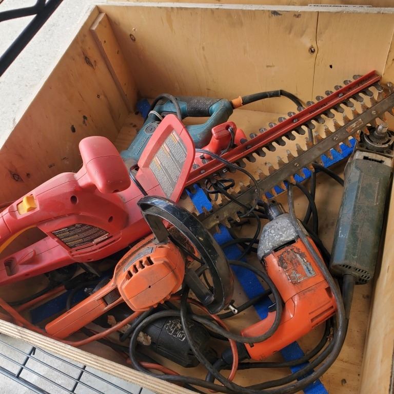 CRATE OF POWER TOOLS, INCLUDING HEDGE TRI8MMERS, GRINDERS AND MORE