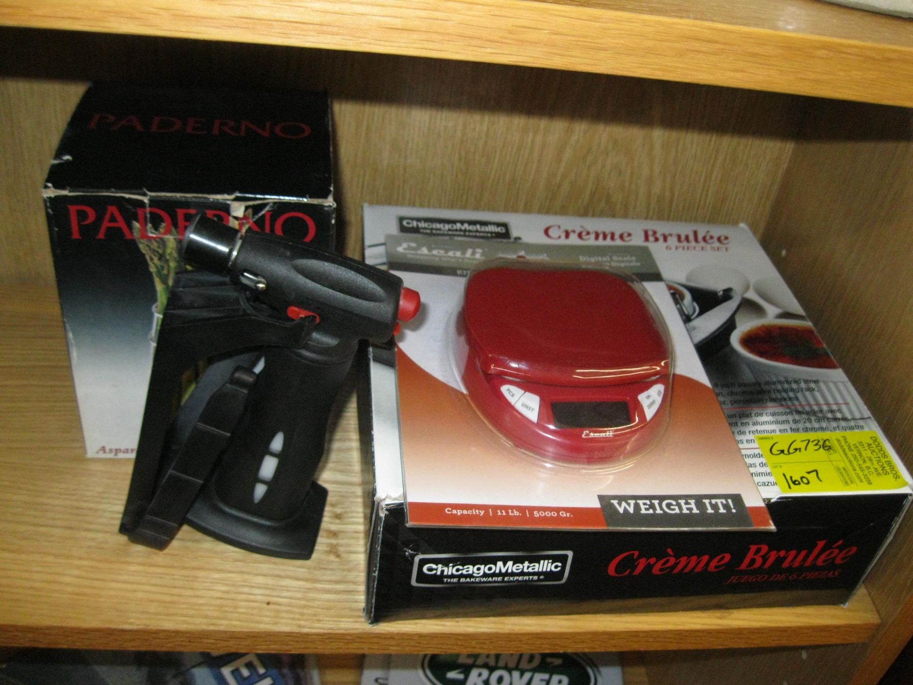 CREME BRULE SET, TORCH, KITCHEN SCALE, ETC.