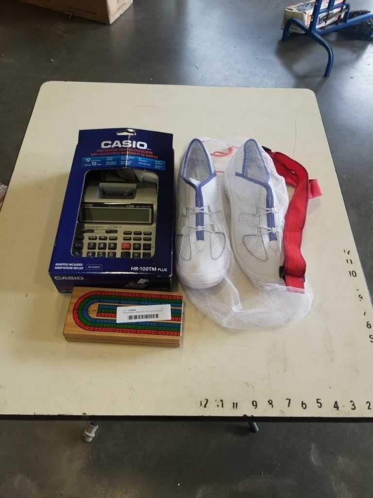 CRIB BOARD, DESKTOP CALCULATOR AND NEW SHOES