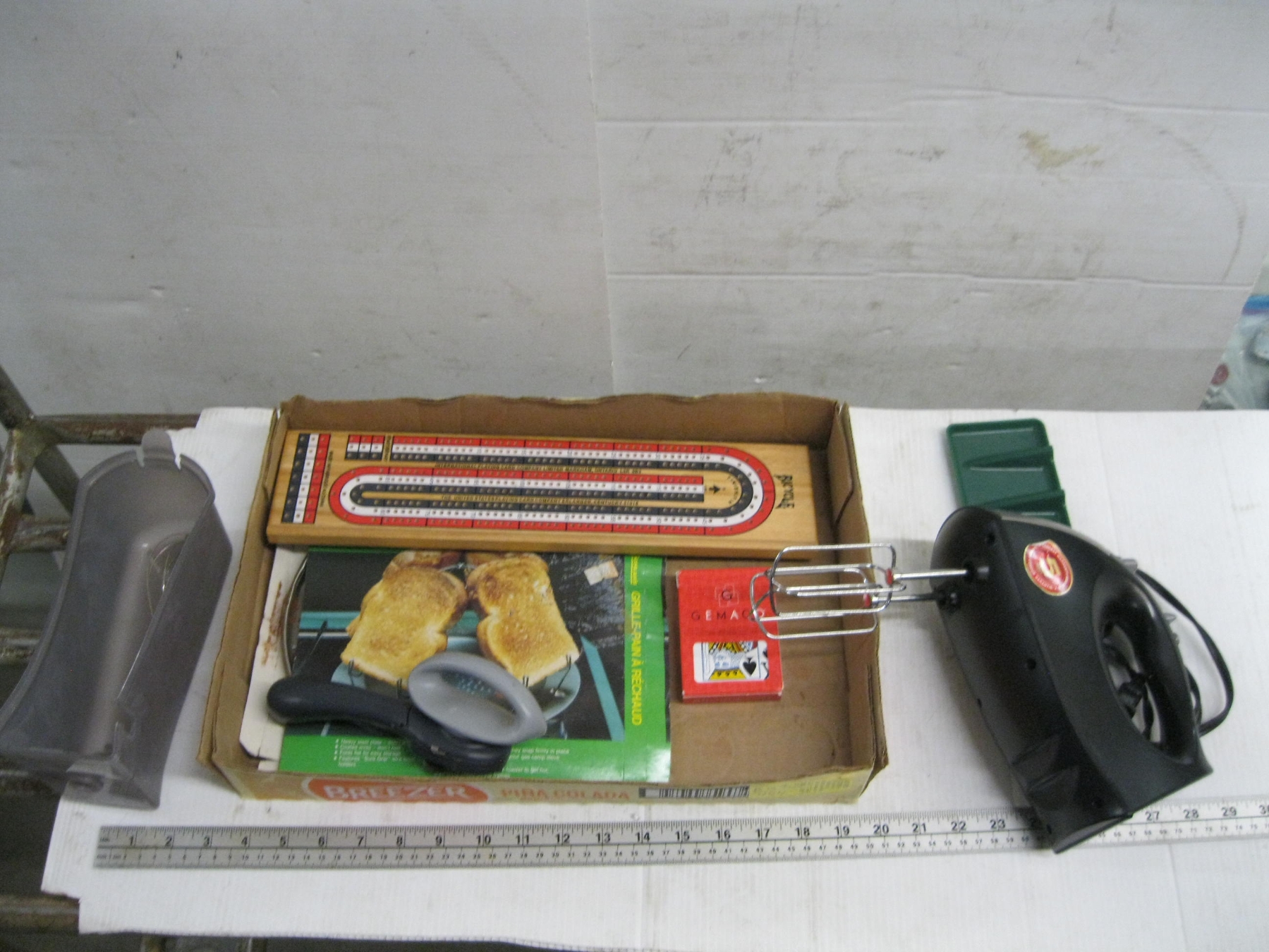 CRIB BOARD, HAND MIXER, OPENER, ETC.