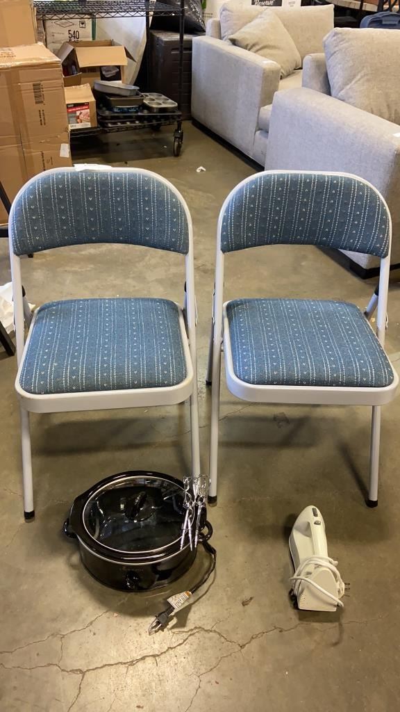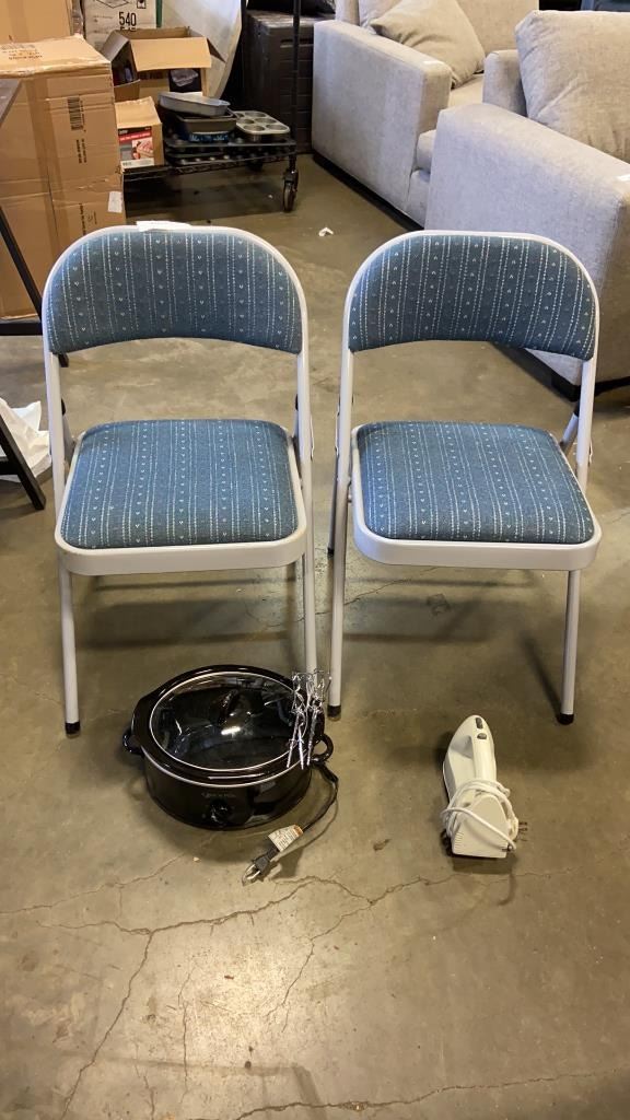 CROCKPOT, 2 METAL FOLDING CHAIRS AND HAND MIXER