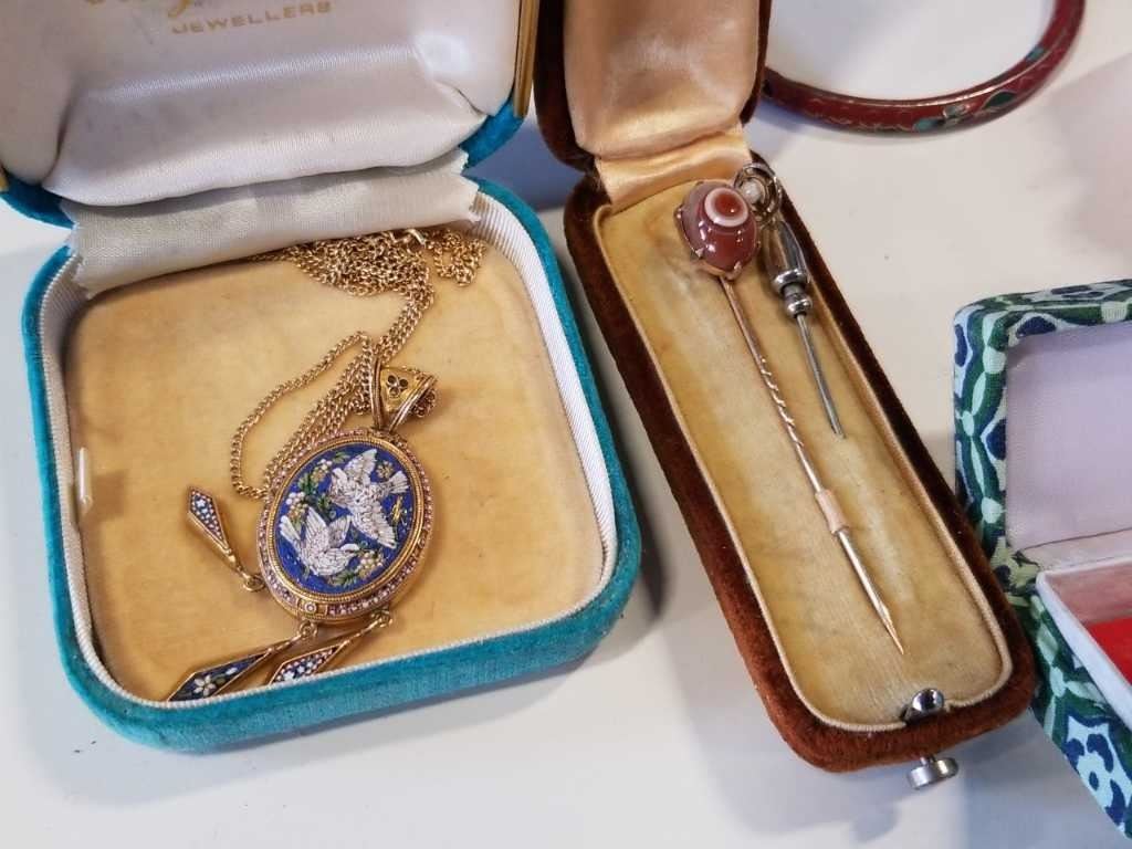 CROWN STAFFORDSHIRE PIN, DENTON EARRING SET, CLOISONNE BRACELETS AND CHOPSTICKS, WOOD EASTERN CUFFLINK AND TIE CLIP SET AND VINTAGE LOCKET WITH HAIR