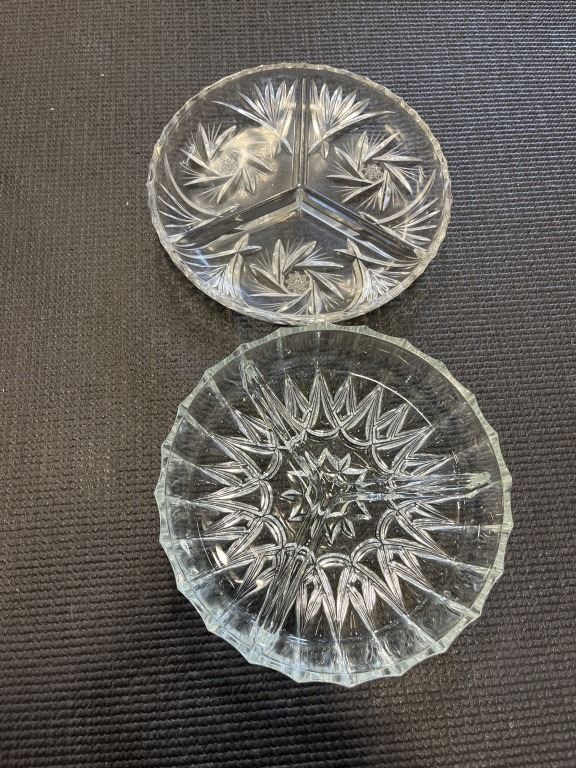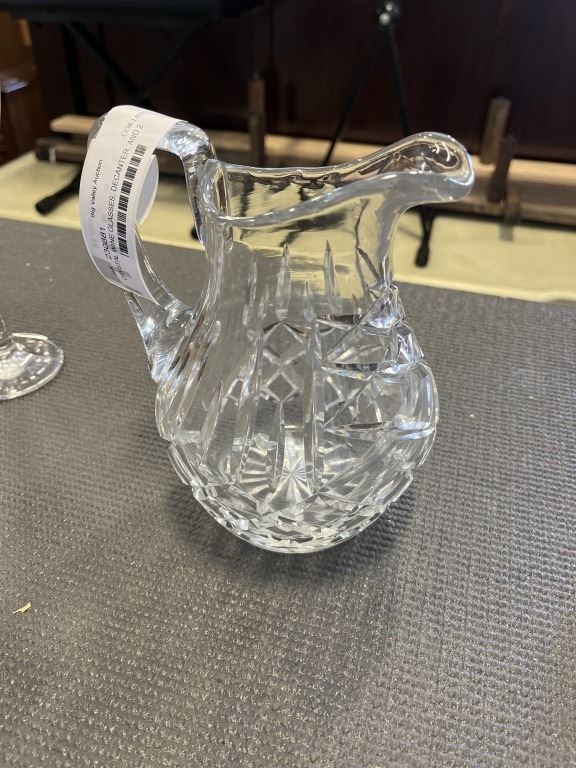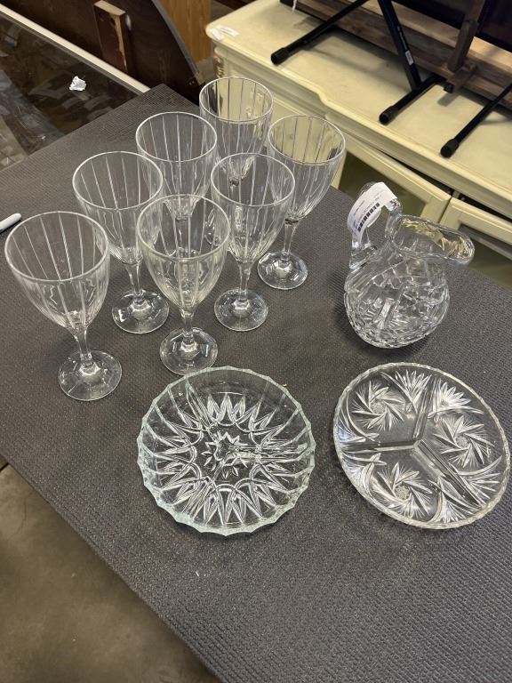 CRYSTAL WINE GLASSES, DECANTER, AND 2 SERVING DISHES