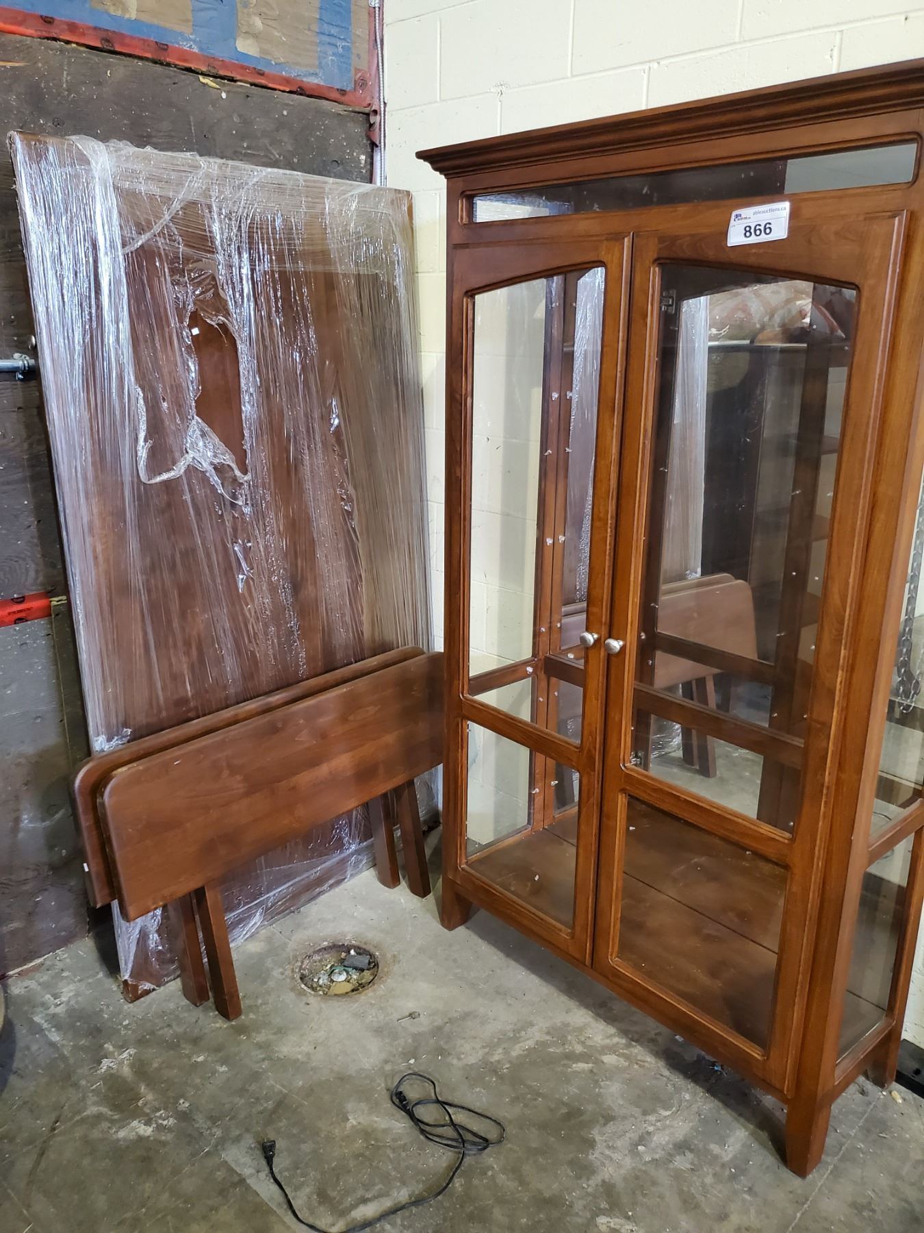 CURIO CABINET (MISSING SHELVES & 1 PANE OF DOOR GLASS) & TABLE (NO LEGS)