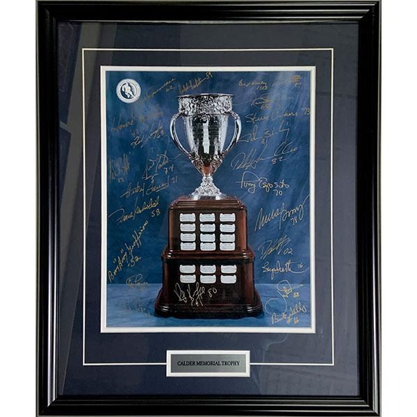 Get this amazing Calder Trophy framed 11X14 photo that has been autographed by 24 past winners. Autographs include Meeker (1947), Geoffrion (1952), Worsley (1953), F. Mahovlich (1958), Backstrom (1959), Rousseau (1962), Douglas (1963), Selby (1966), Sanderson (1968), T. Esposito (1970), Perreault (1971), Vickers (1973), D. Potvin (1974), Trottier (1976), Bossy (1978), Bourque (1980), Stastny (1981), Hawerchuk (1982), Larmer (1983), Robitaille (1987), Nieuwendyk (1988), Brodeur (1994), Heatley (2002), and Raycroft (2004). Comes with Certificate of Authenticity and holofoil.