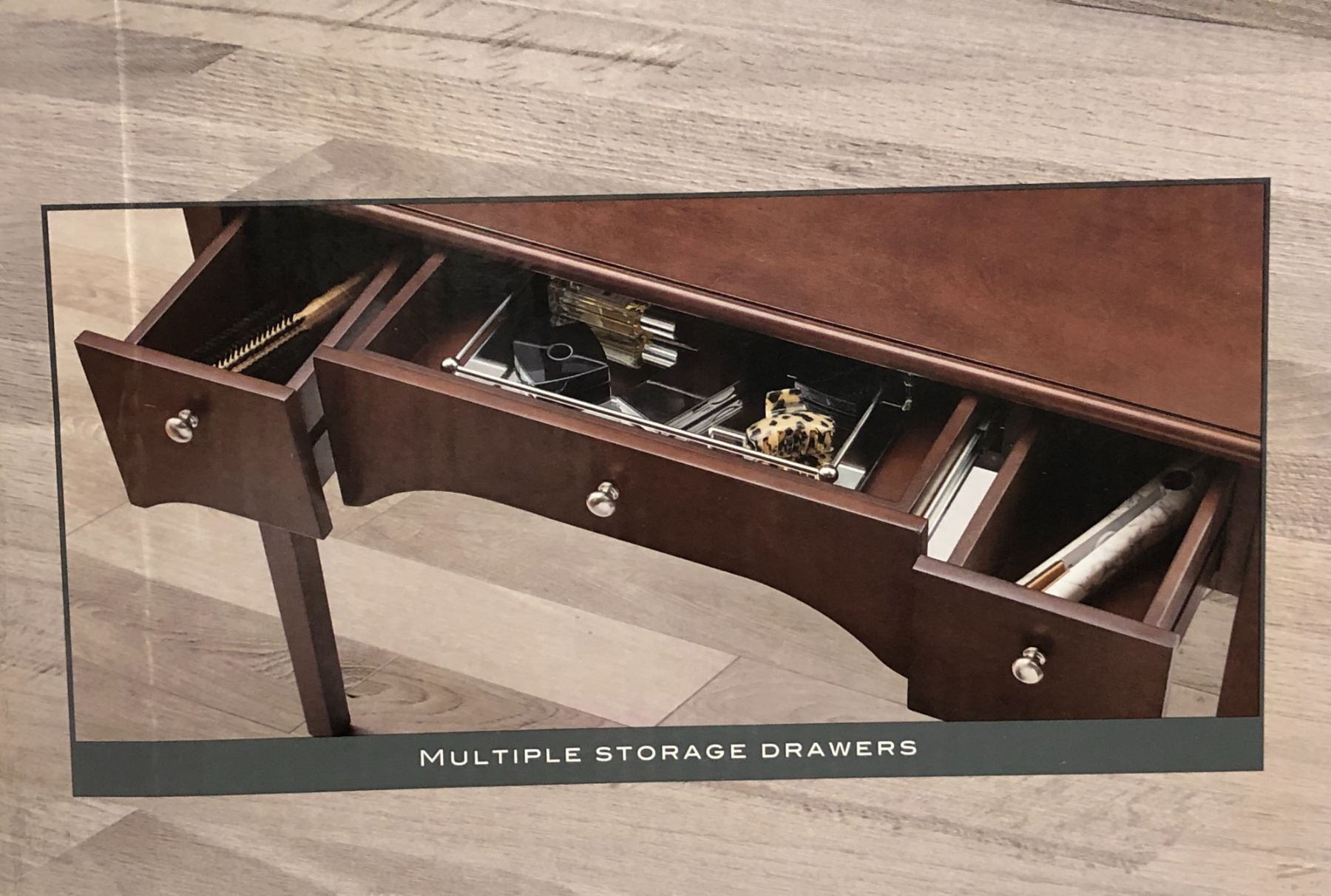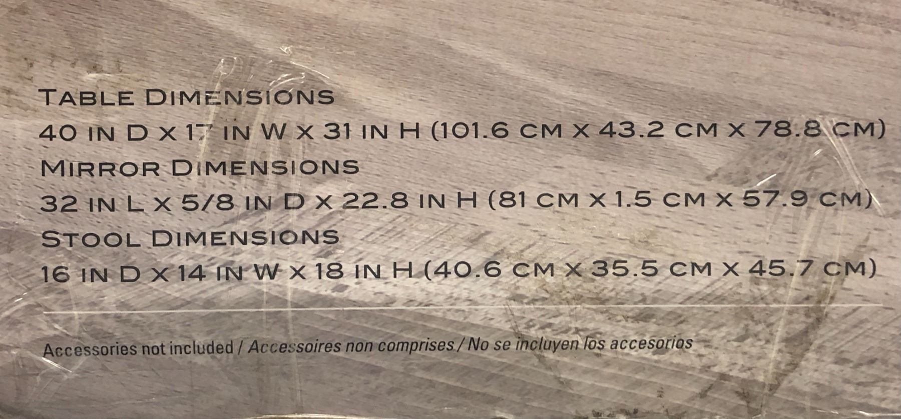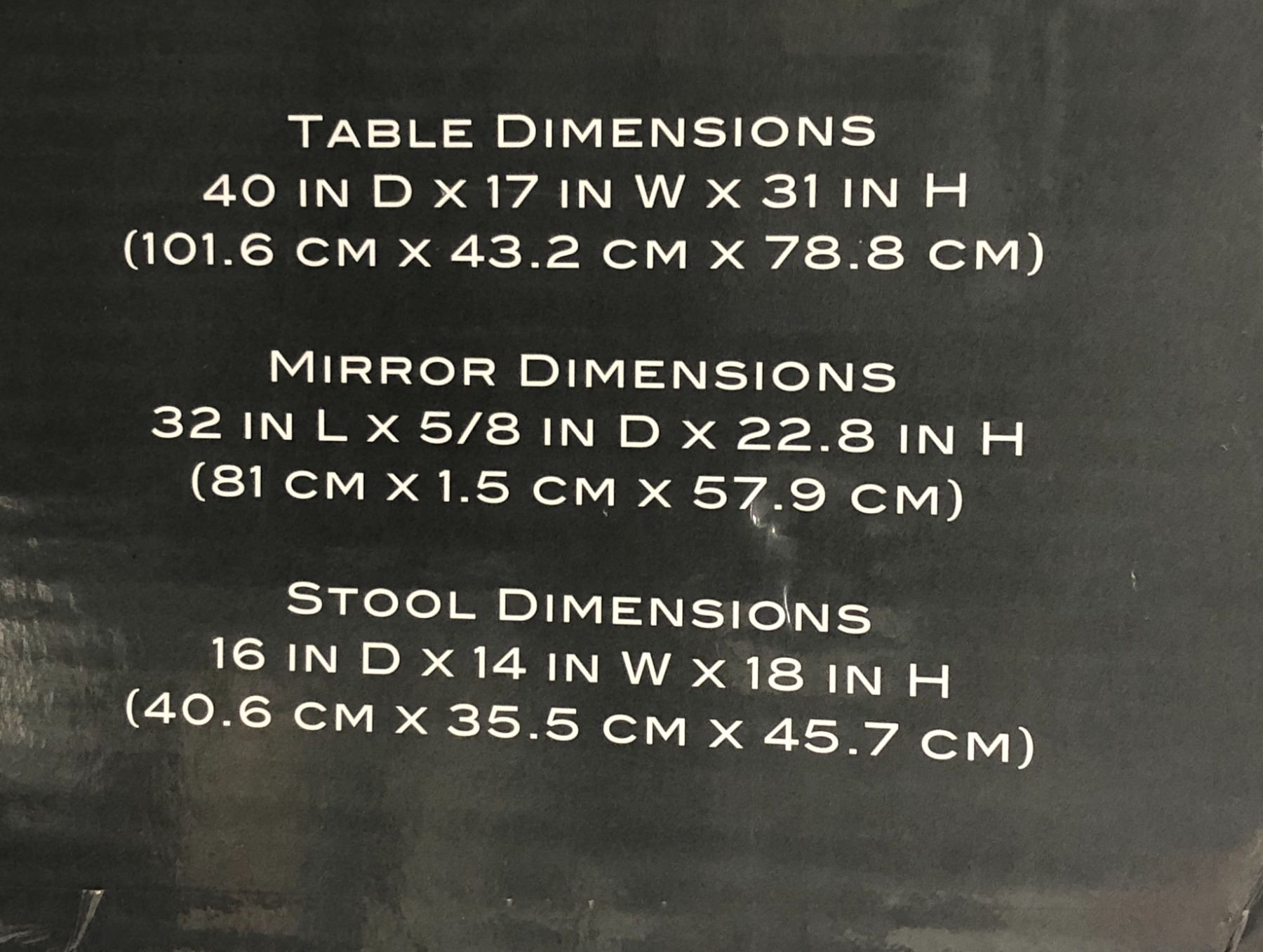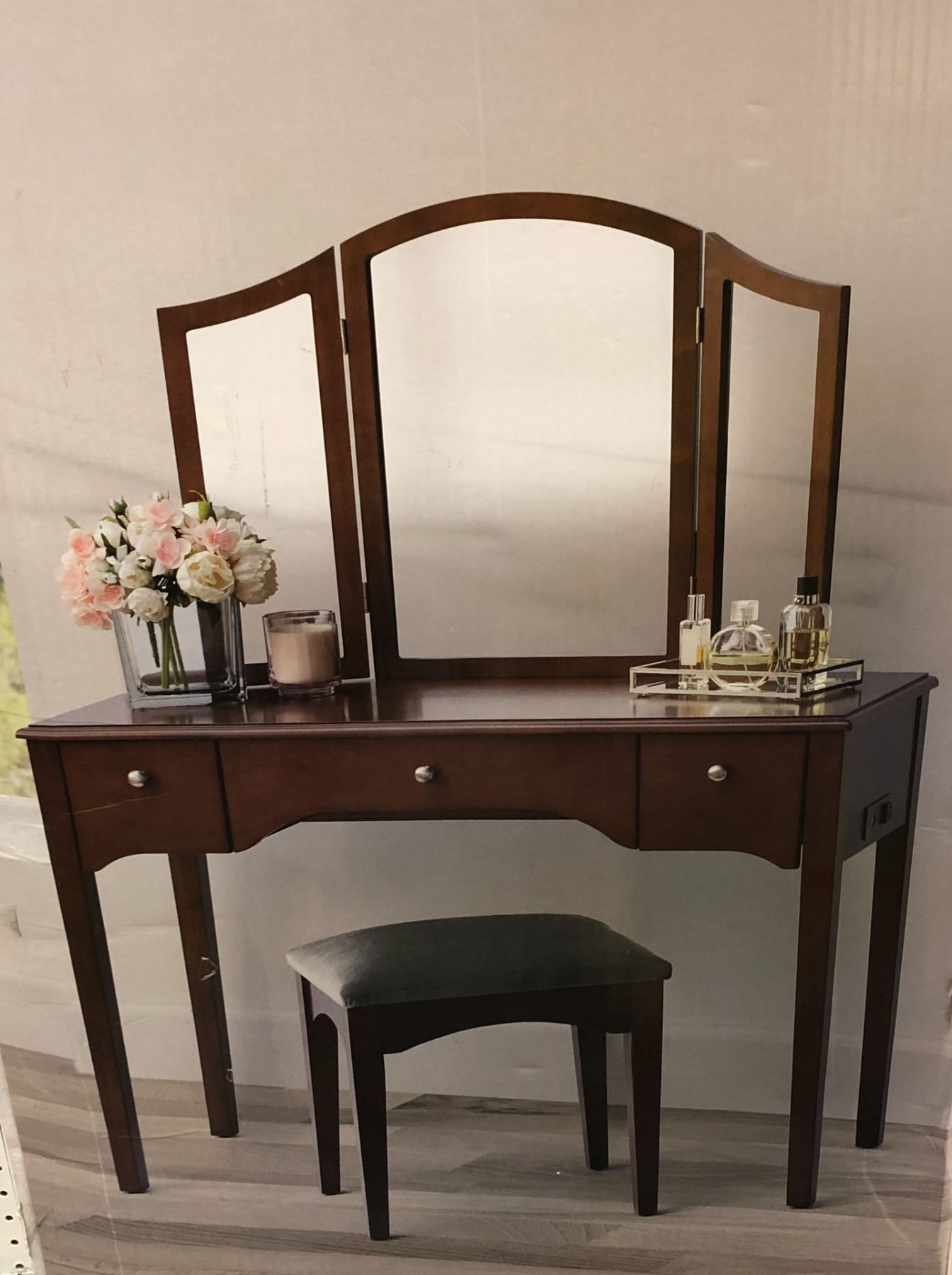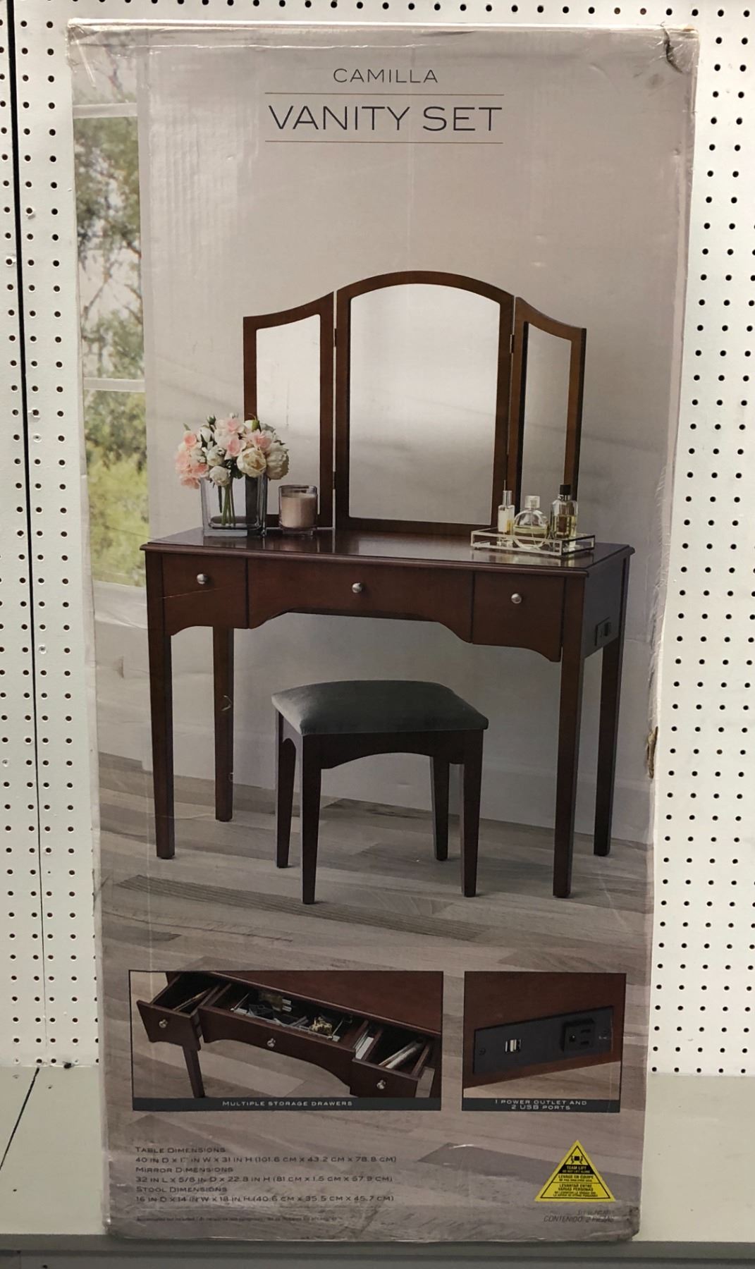 Camilla vanity set new in box - Includes adjustable tri-fold mirror/ multiple storage drawers/ 1 power outlet & 2 USB ports (see pictures for dimensions)