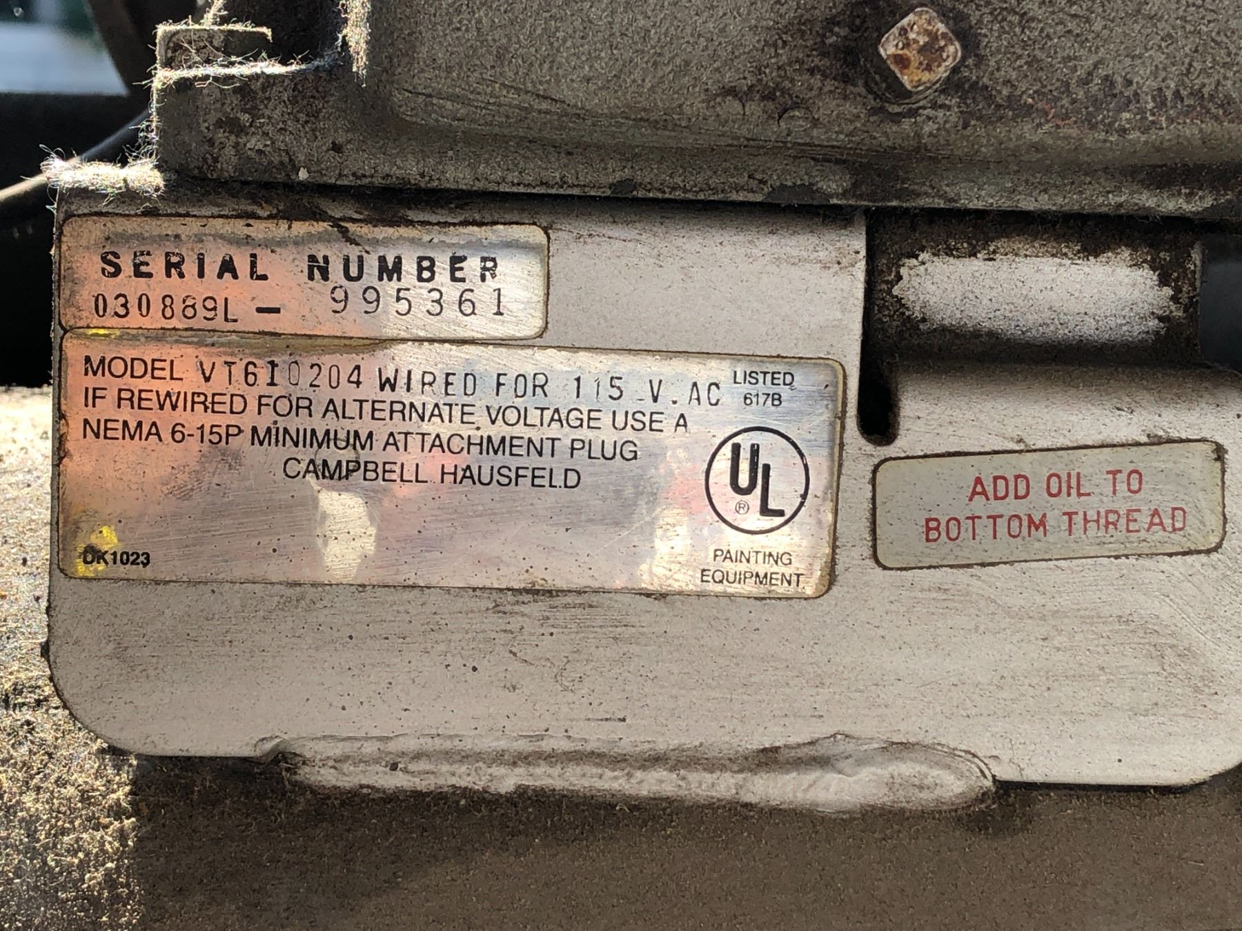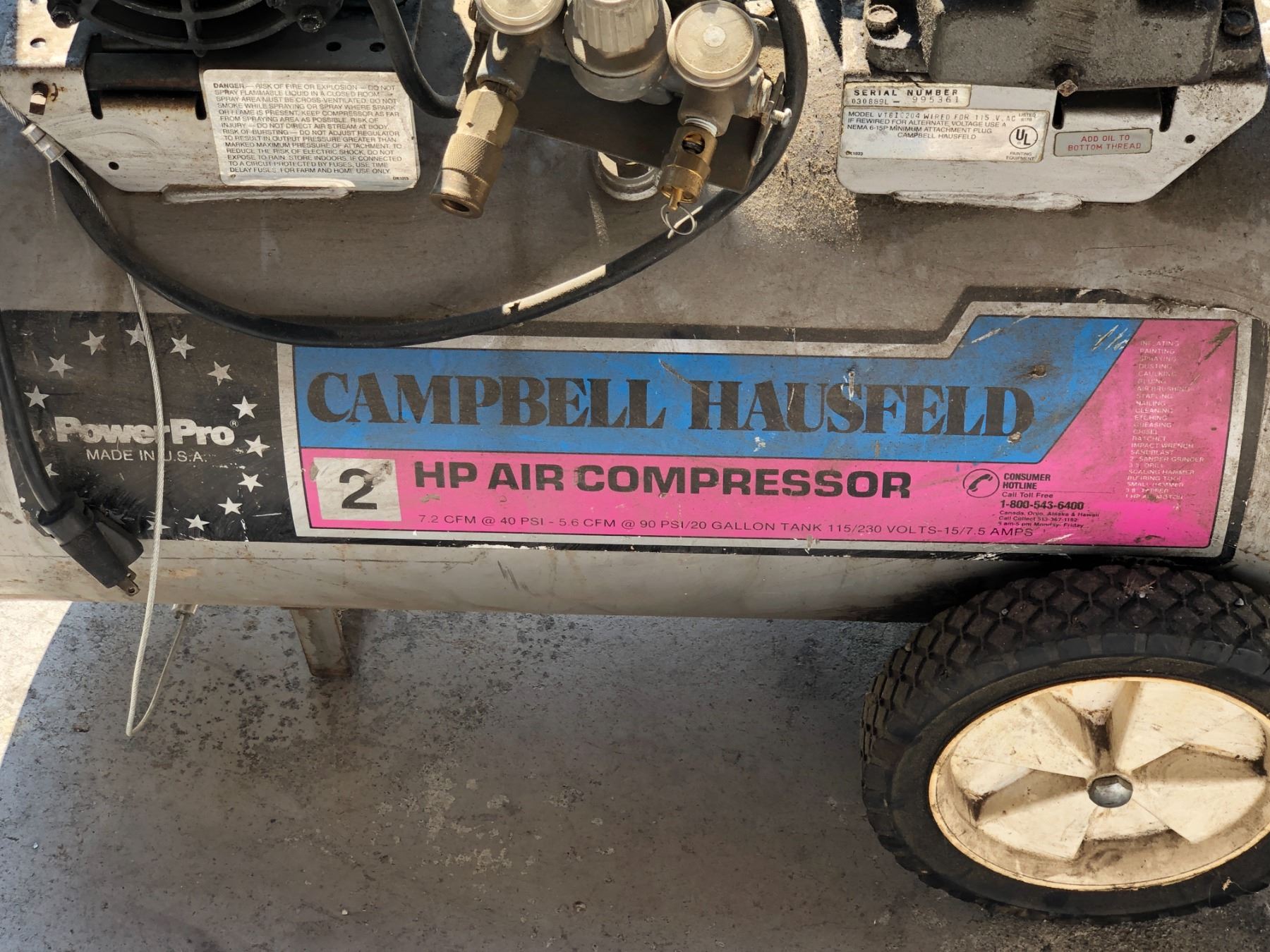 Campbell Hausfeld HP air compressor power pro made in USA model VT610204 serial number 030889L - 995361