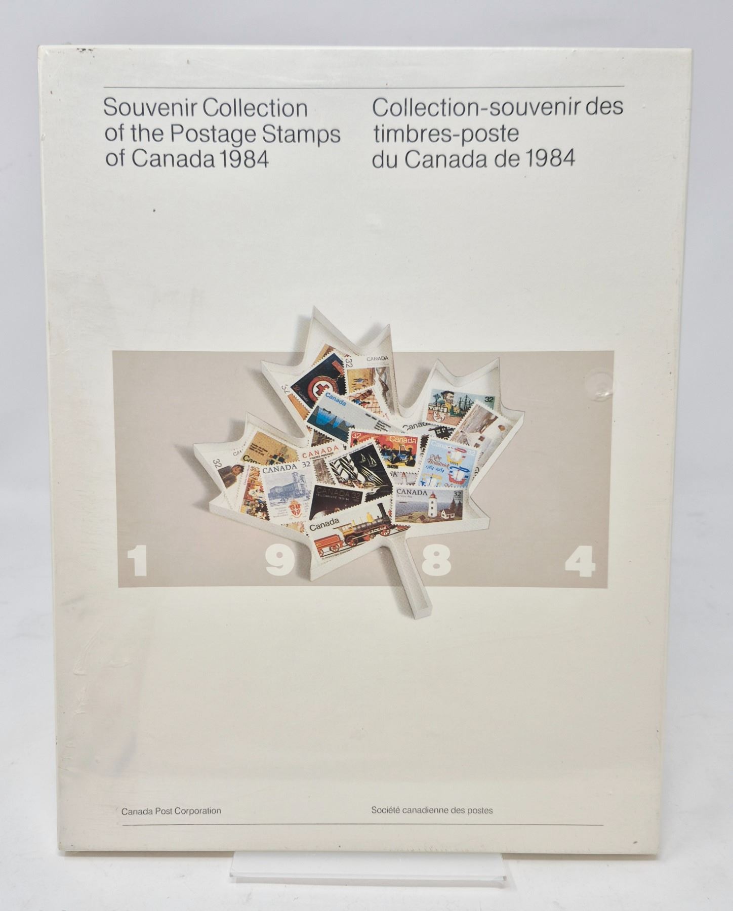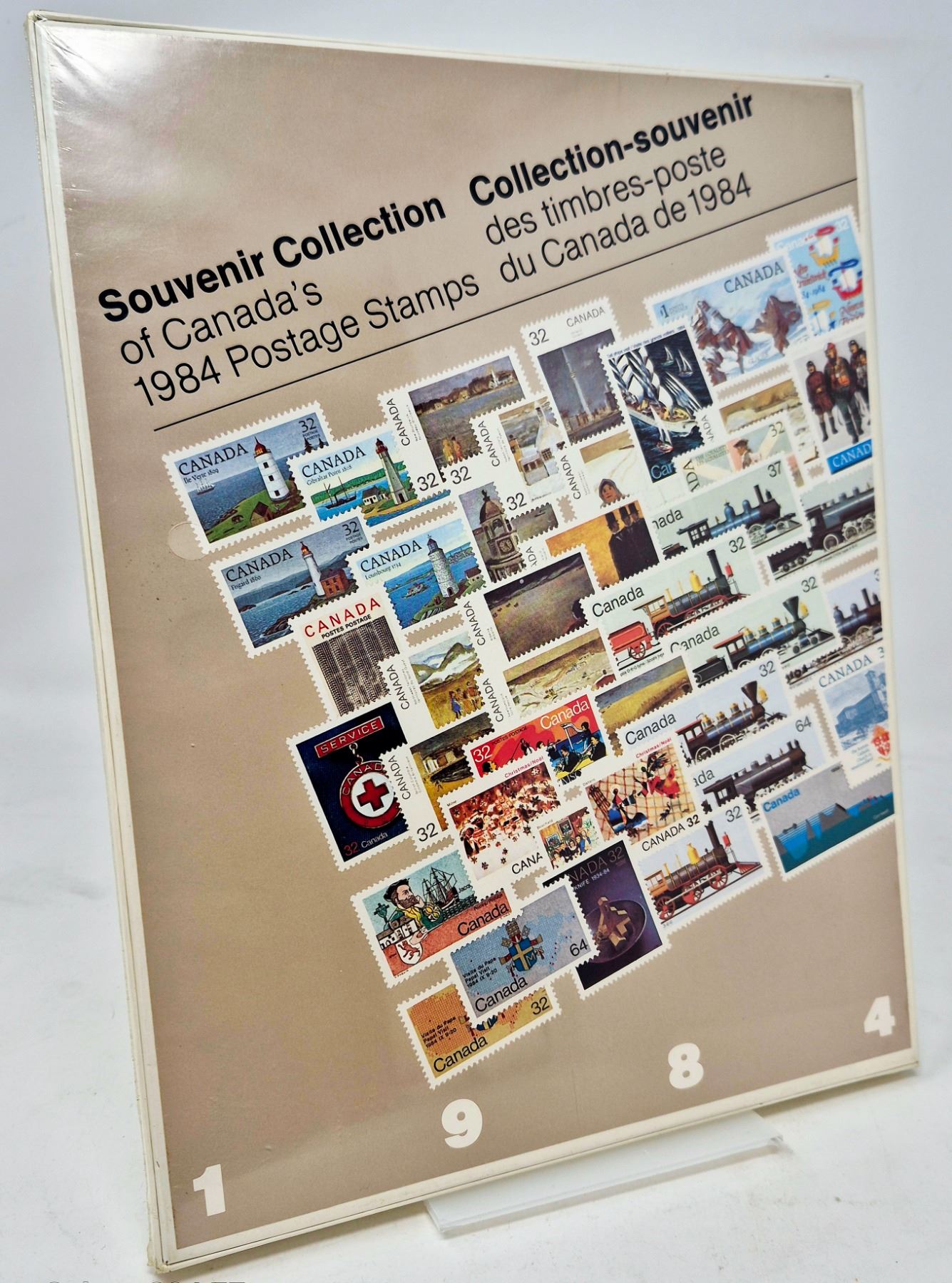 A complete and mounted presentation of Canada's official 1984 postage stamps. Includes thematic designs of trains, lighthouses, historic events, and cultural icons. Clean, well-preserved condition in original folder.