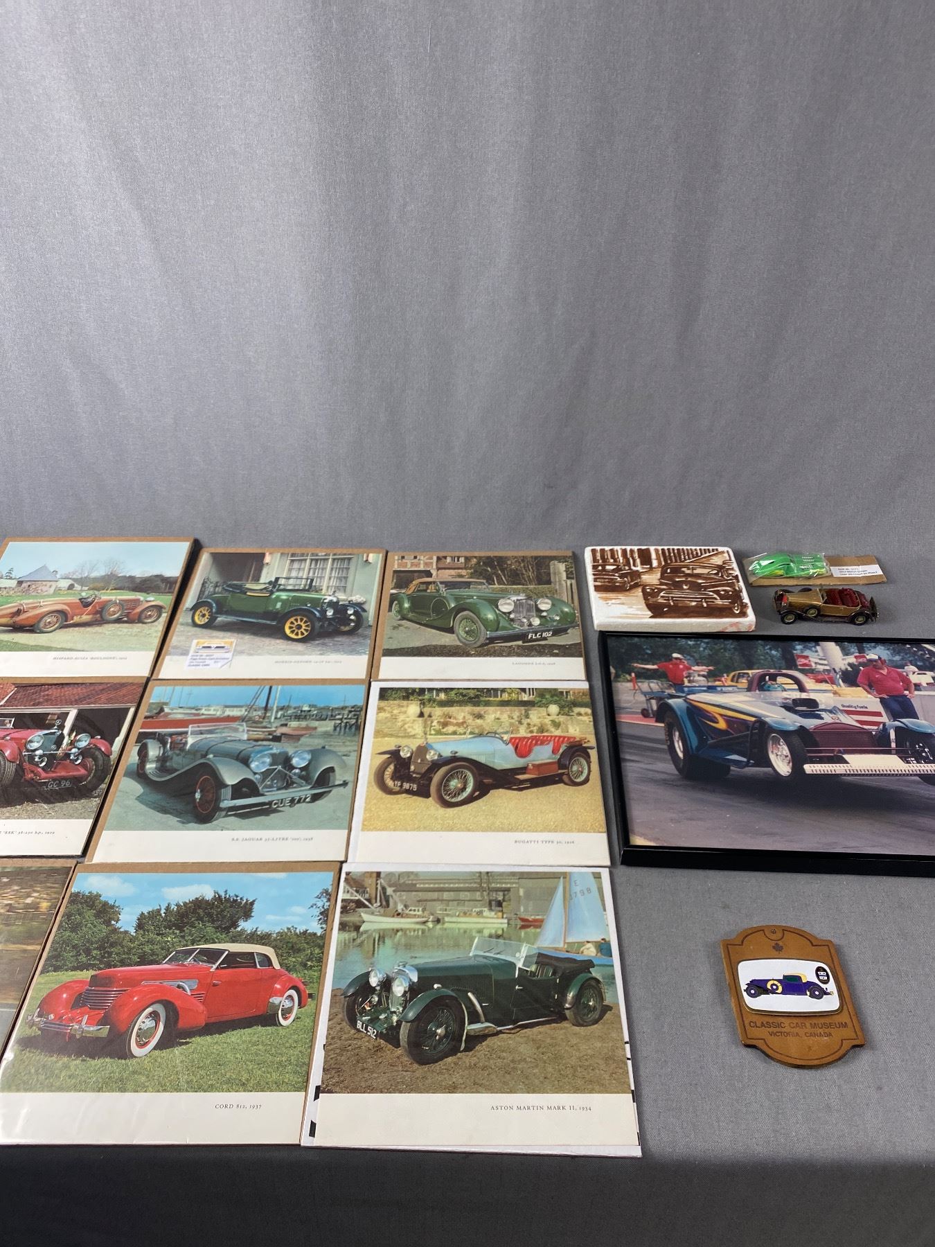 Car Décor Lot - 9 European Classic Car Pictures (8"x8"), Matchbox Packard, 11" x 14" RaceCar Photo & More