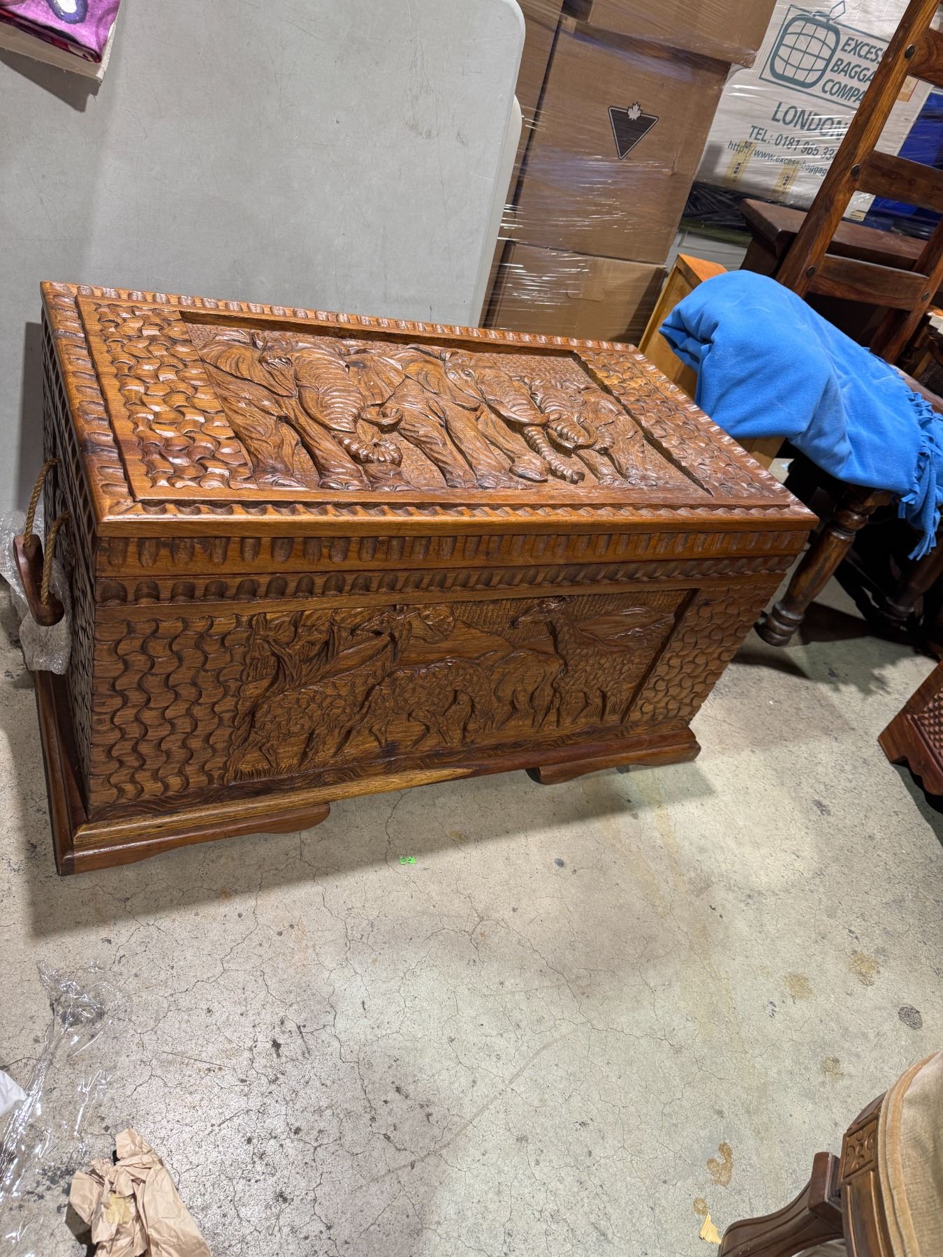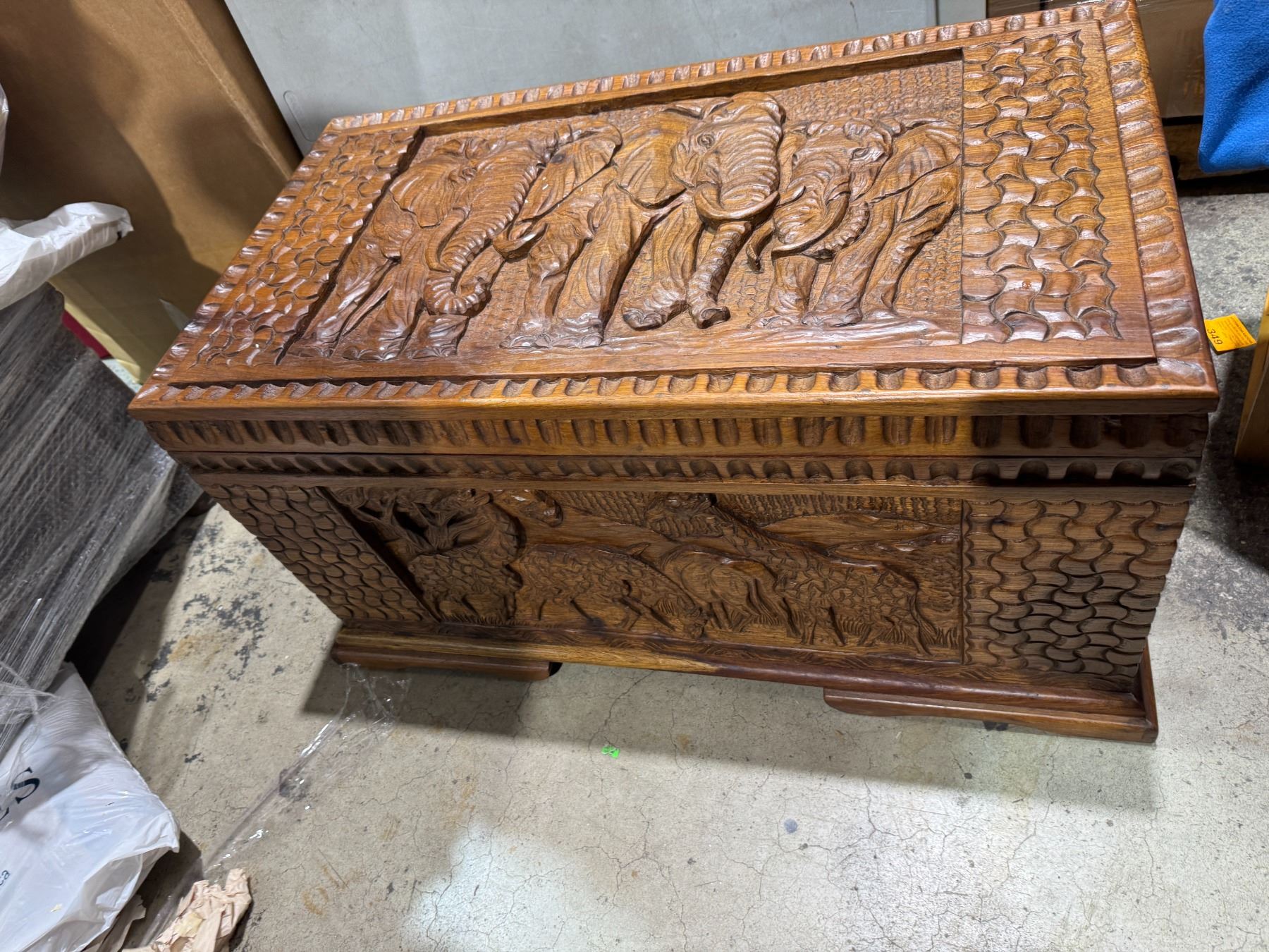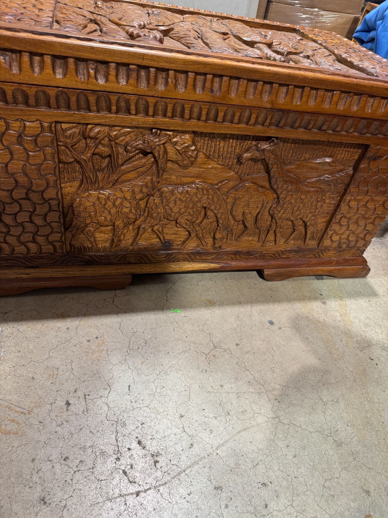 Carved African themed chest measures 35" x 19 1/4" x 18 1/2"