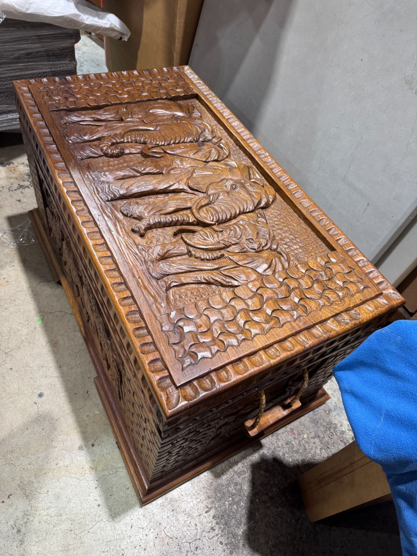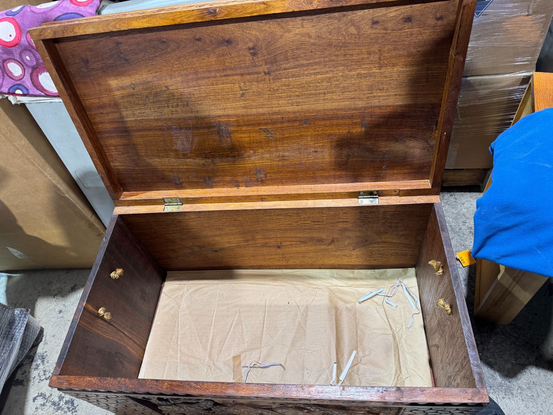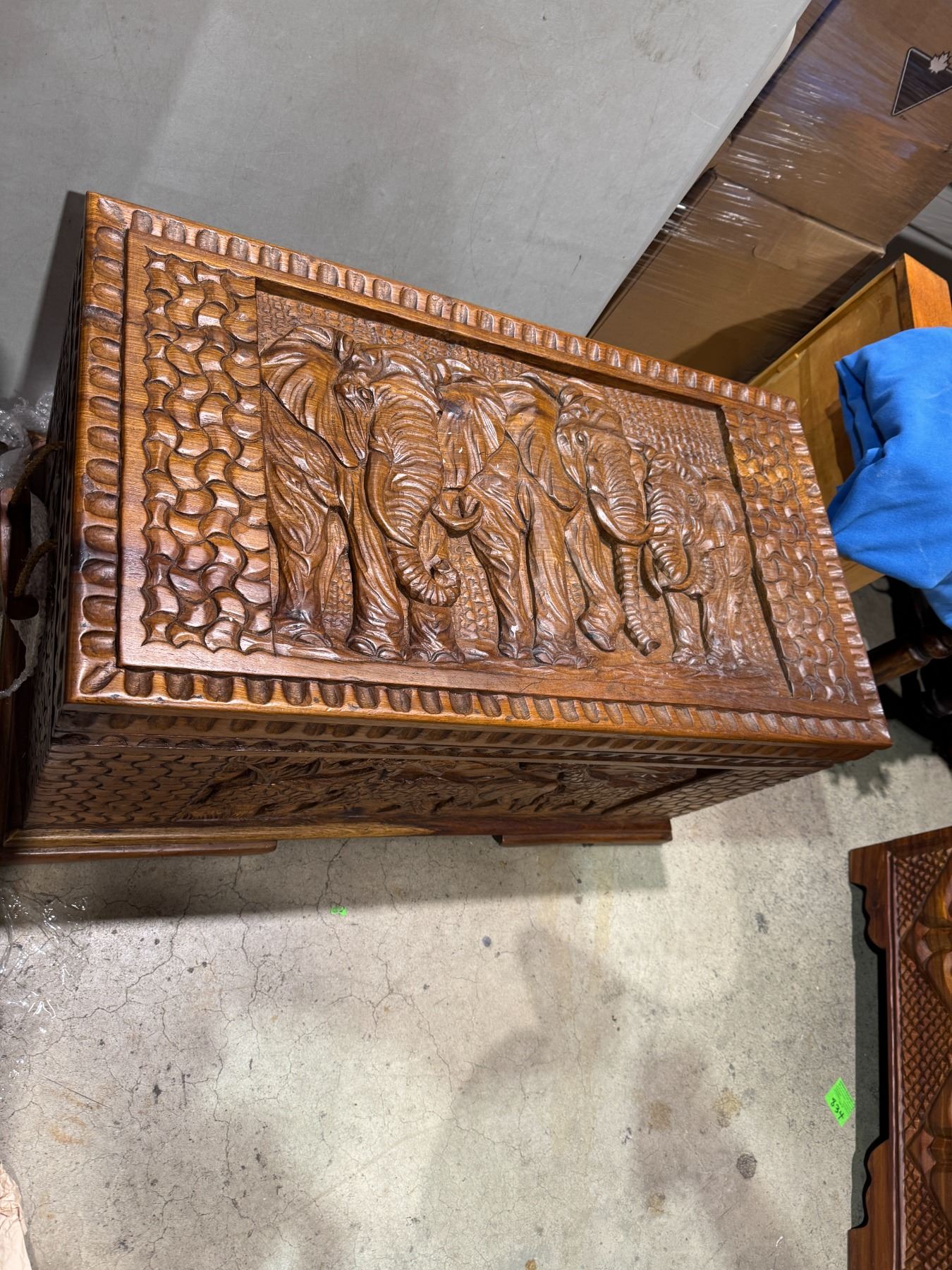 Carved African themed chest measures 35" x 19 1/4" x 18 1/2"