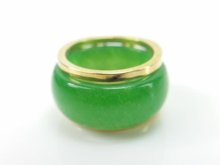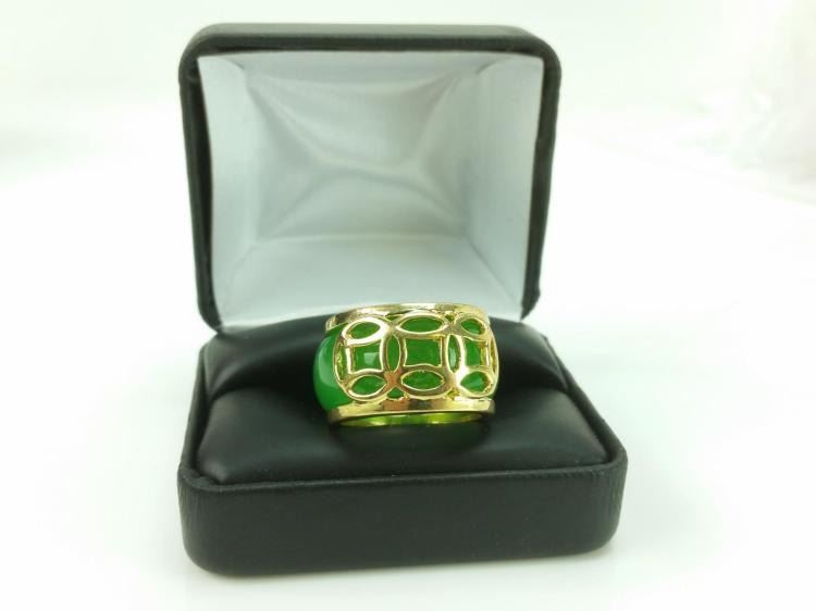 Carved Jade Ring Mounted in 14 kt Gold Overlay.The tasteful gold overlay on this carefully designed jade ring sets it apart from other pieces.Note The Fine Craftmanship On This Ring: Size 9.--12 mm. Wide. Approx. Net Weight 10.5 Grams. Ring box in phote not included