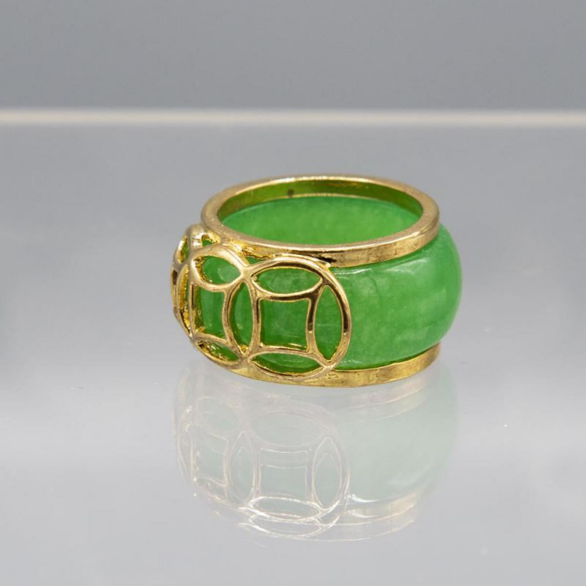 Carved Jade Ring Mounted in 14 kt Gold Overlay.The tasteful gold overlay on this carefully designed jade ring sets it apart from other pieces.Note The Fine Craftmanship On This Ring: Size 9 and 12 mm. Wide. Approx. Net Weight 10 Grams. Ring box in phote not included