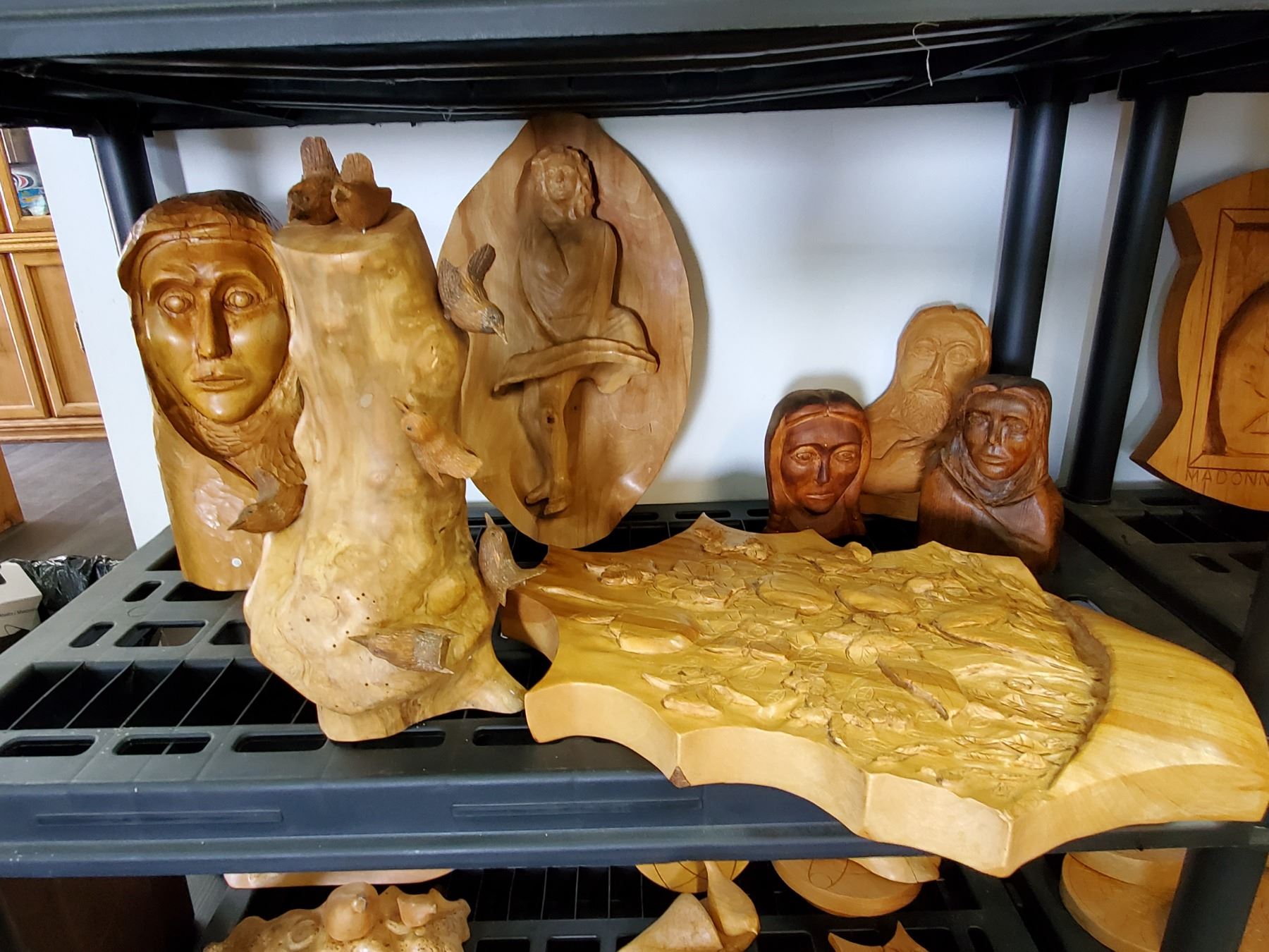 Carvings- 4 Lady heads - Birds on a Branch - Girl Wall Hanging - and more -- World Famous Signed Paul Bourbeau Carvings -- 17% Buyer Fee. Payment Processed through Live Auction World ( Visa or Master Card ) pick up Saturday, or Tuesday
