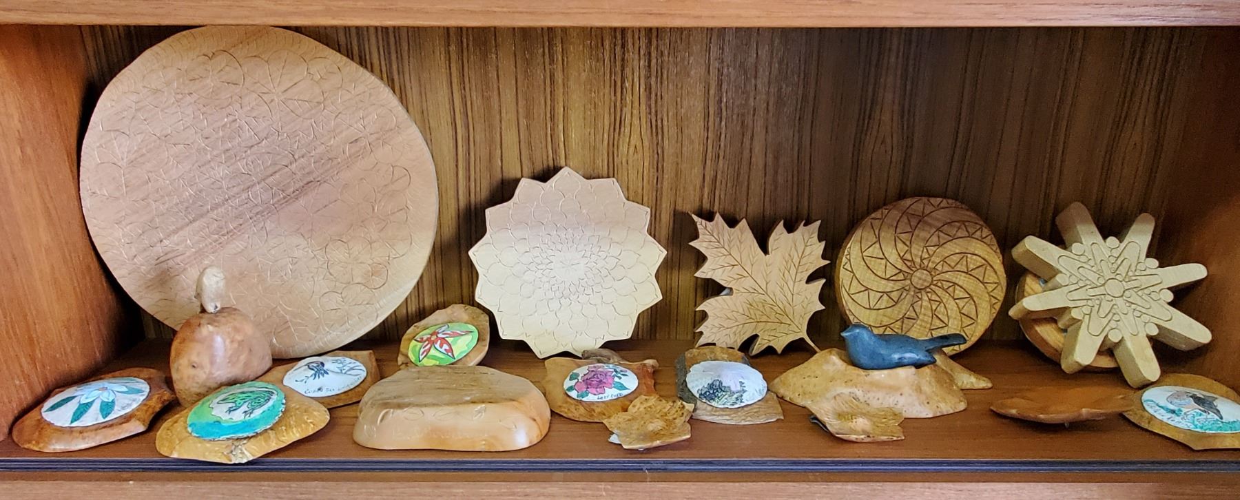 Carvings - Bird maple leaf 7 painted sand dollars & 4 wall hangings -- World Famous Signed Paul Bourbeau Carvings -- 17% Buyer Fee. Payment Processed through Live Auction World ( Visa or Master Card ) pick up Saturday, or Tuesday
