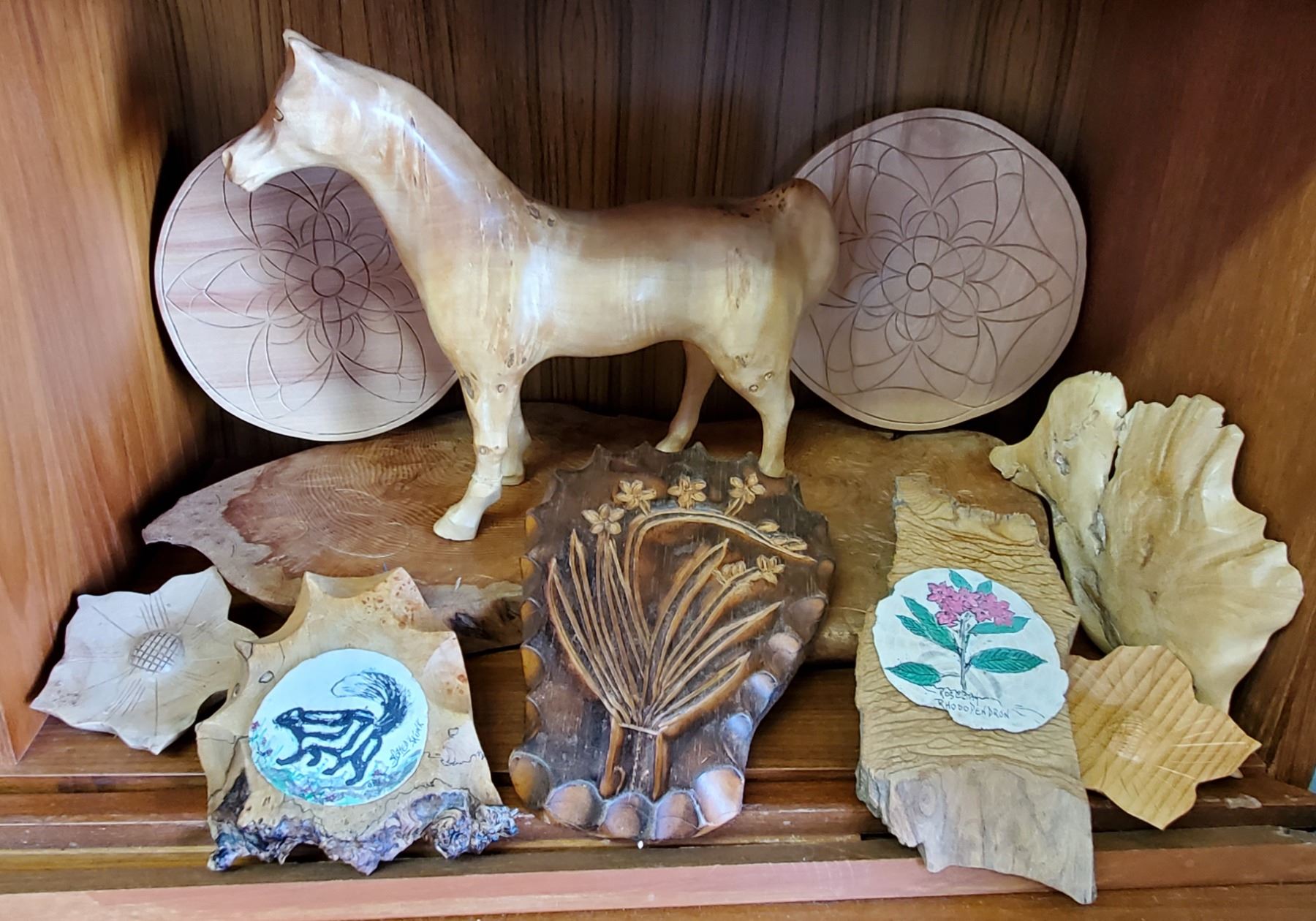 Carvings - Horse - 2 Painted Sand Dollars - Dogwood Flower - and More ….. -- World Famous Signed Paul Bourbeau Carvings -- 17% Buyer Fee. Payment Processed through Live Auction World ( Visa or Master Card ) pick up Saturday, or Tuesday