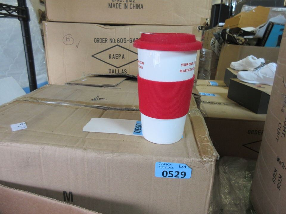Silicone grip and lid. Modern Housewares advertising mugs.