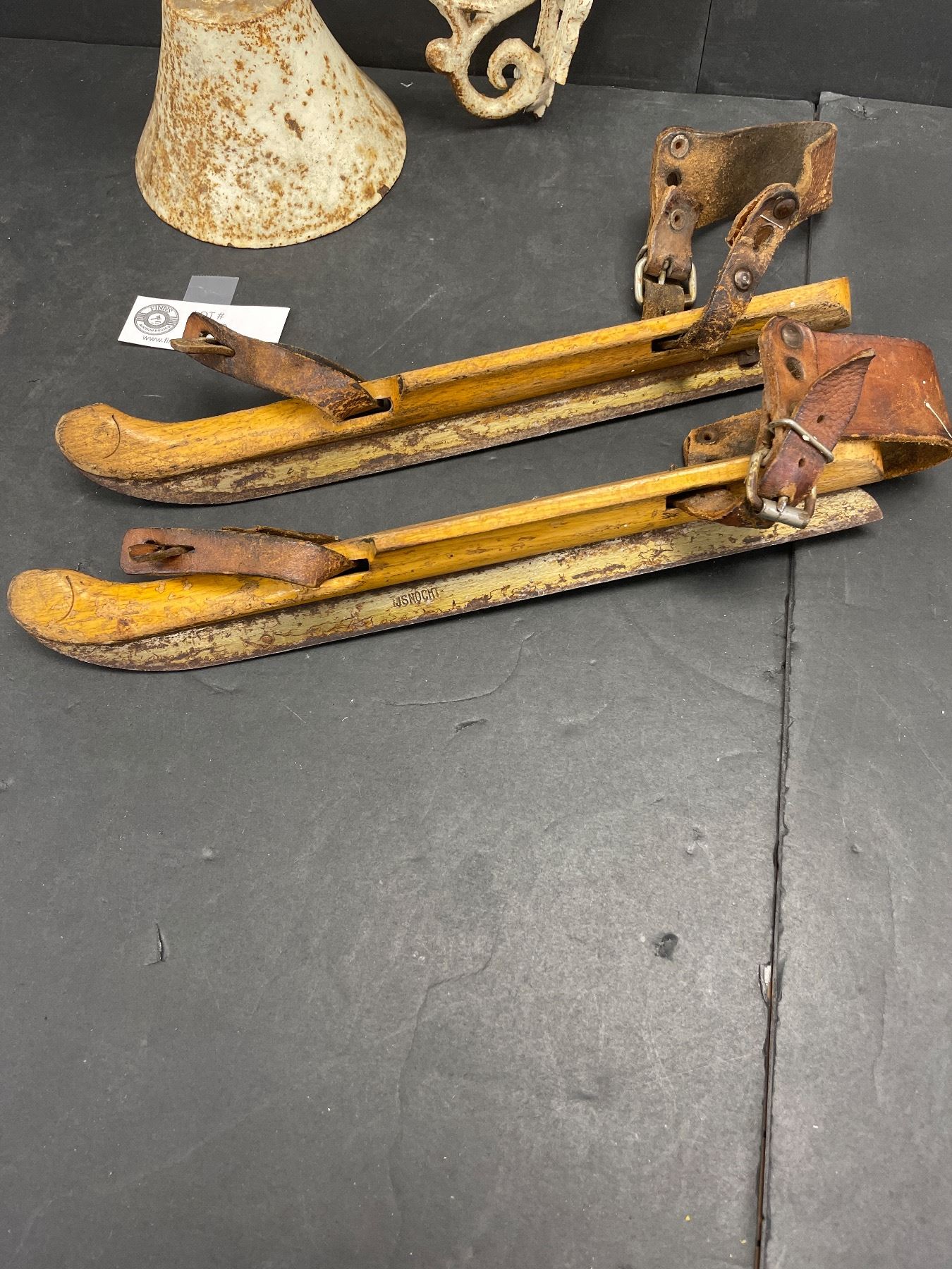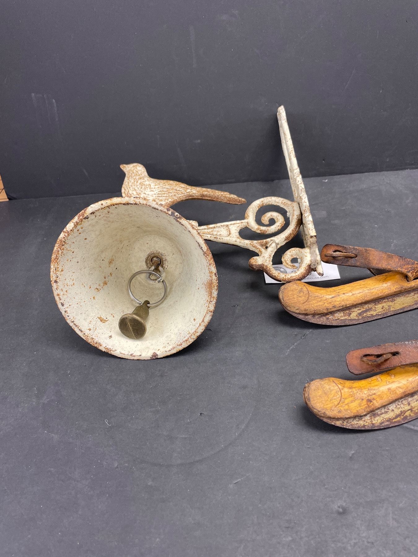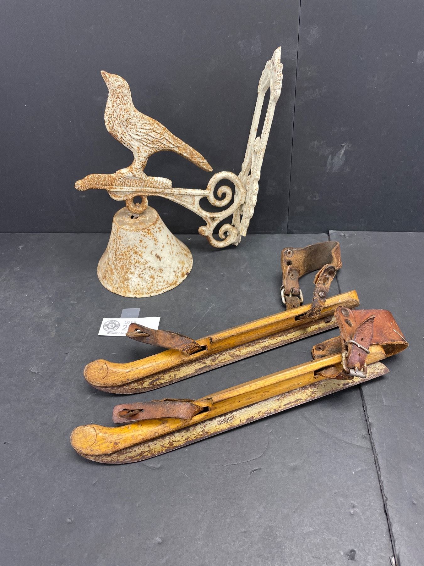 Cast Iron Bell Bird Wall Mount Hanging Bell and Pair of Antique Lisnocht Wooden Ice Skates