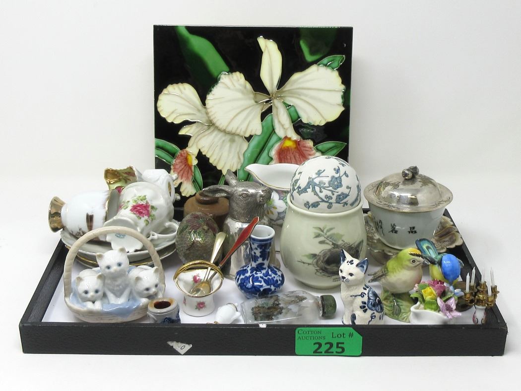 Japanese Otagirl cats in basket, glass snuff bottle, figurines & more.