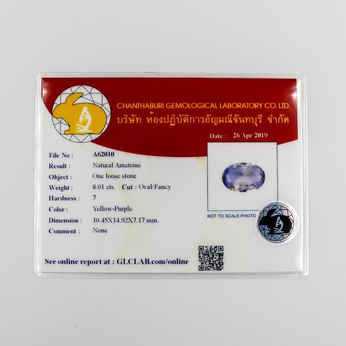 Certified 8.01 Ct Natural Unheated Ametrine. Soft un-heated purple and gold hue. Excellent Clarity. Eye Clean + . Incredible luster and brilliance. Fine oval cut measuring 16.88 x 15.68 x 10.52 mm. Bolivian origin. Treatment none. This eye clean beauty isready to mount.