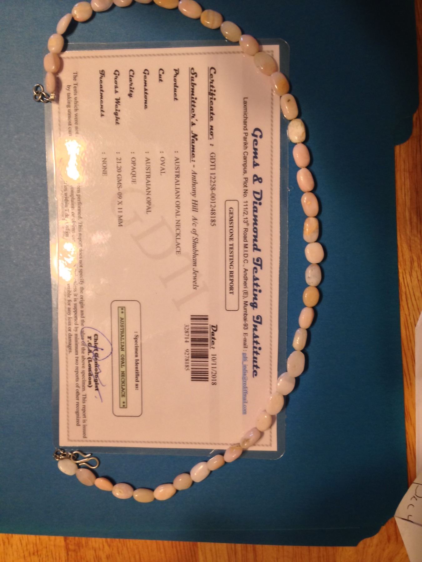 Certified Pink Australian Opal Necklace .17" Long.Weight : 106.00 Cts Dimensions : Approx 9 X 11 mm.Please See Certificate For Further Details