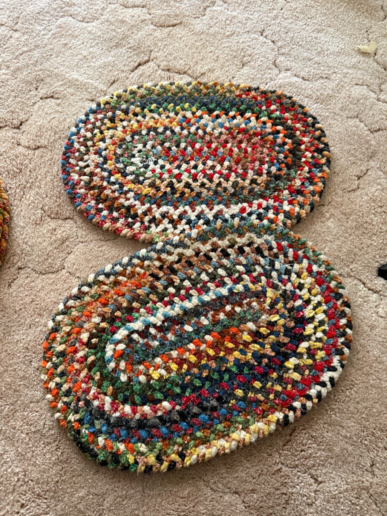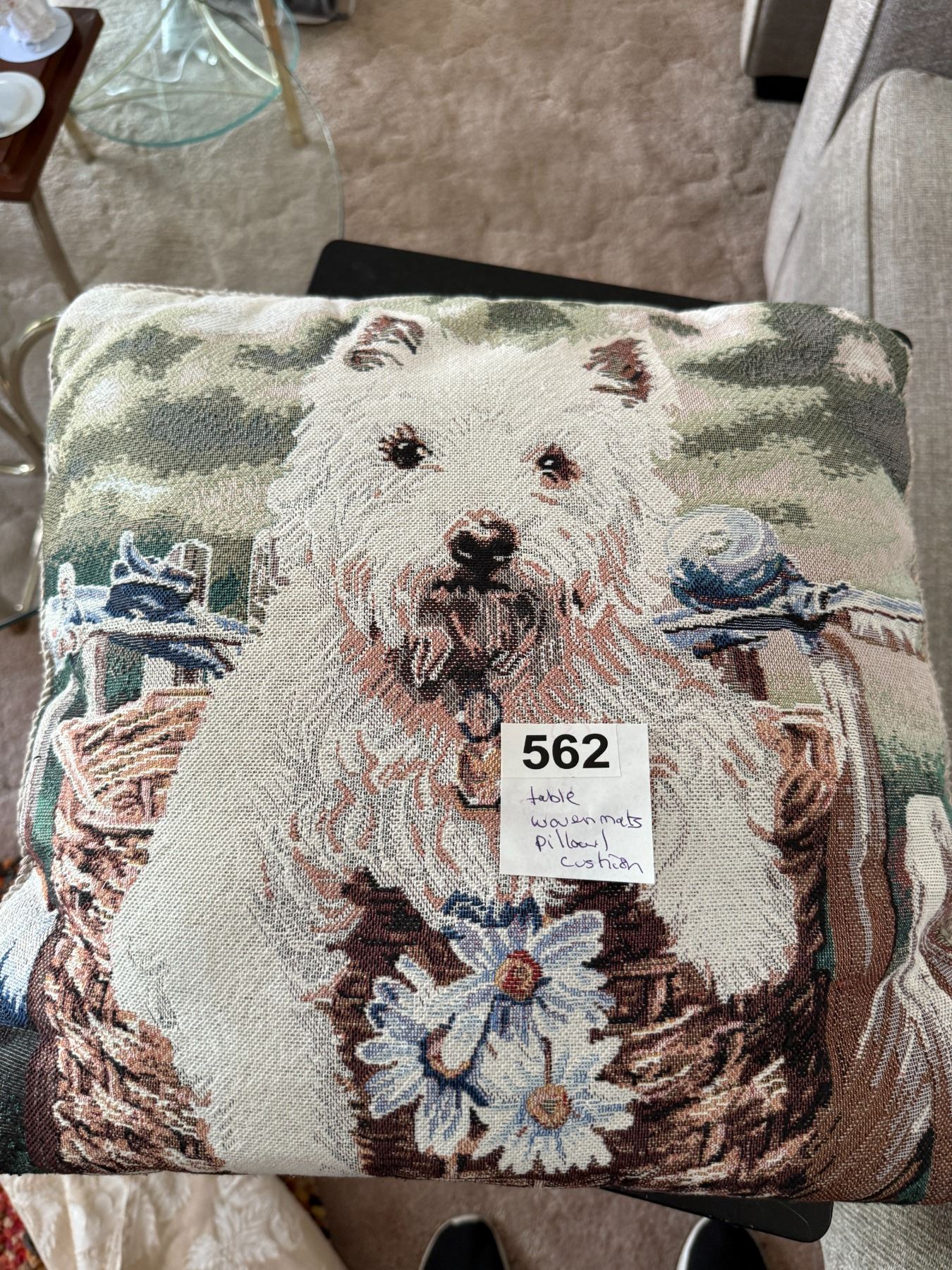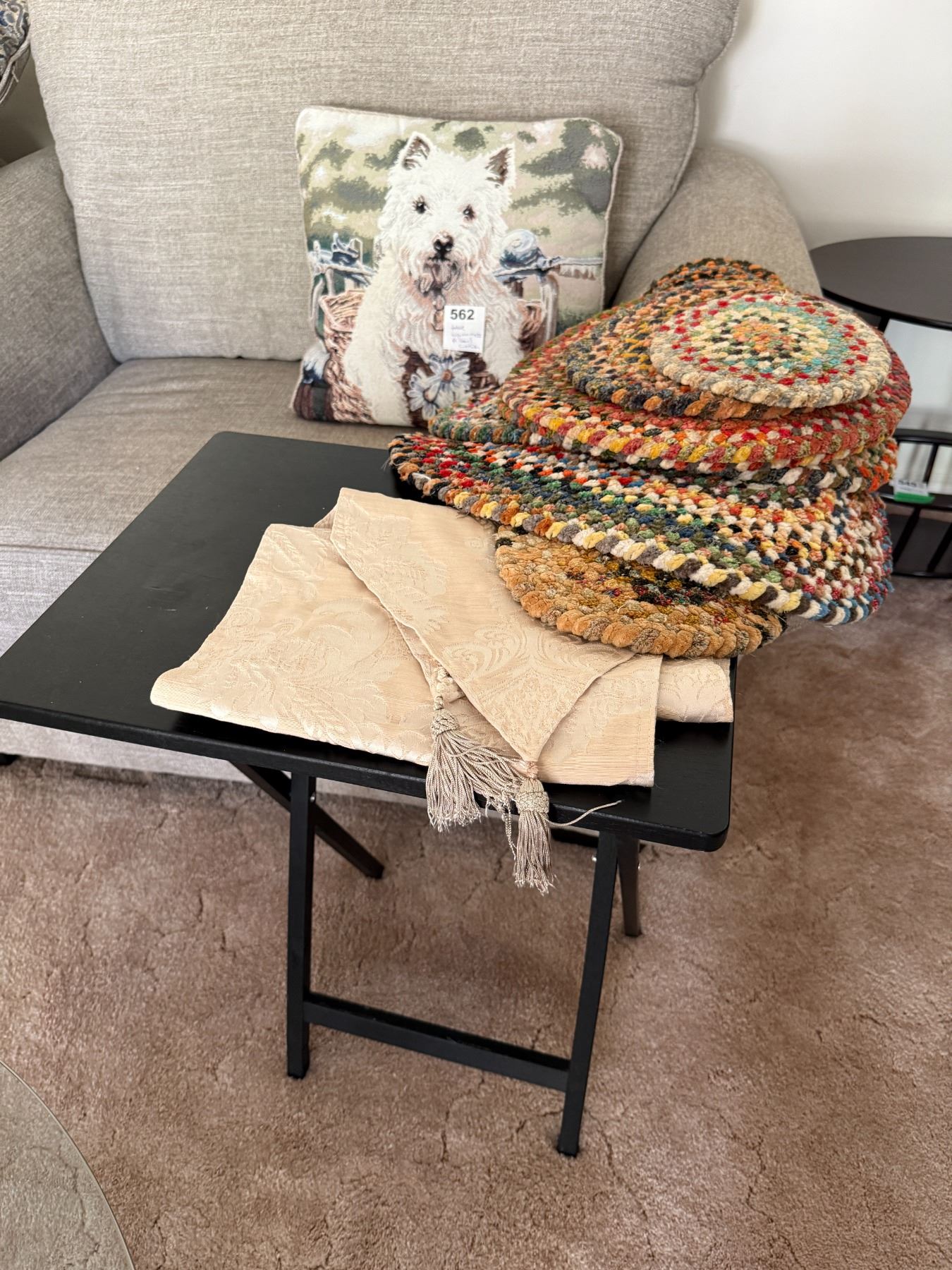 Folding TV tray table, tapestry toss cushion, braided chair and other pads.