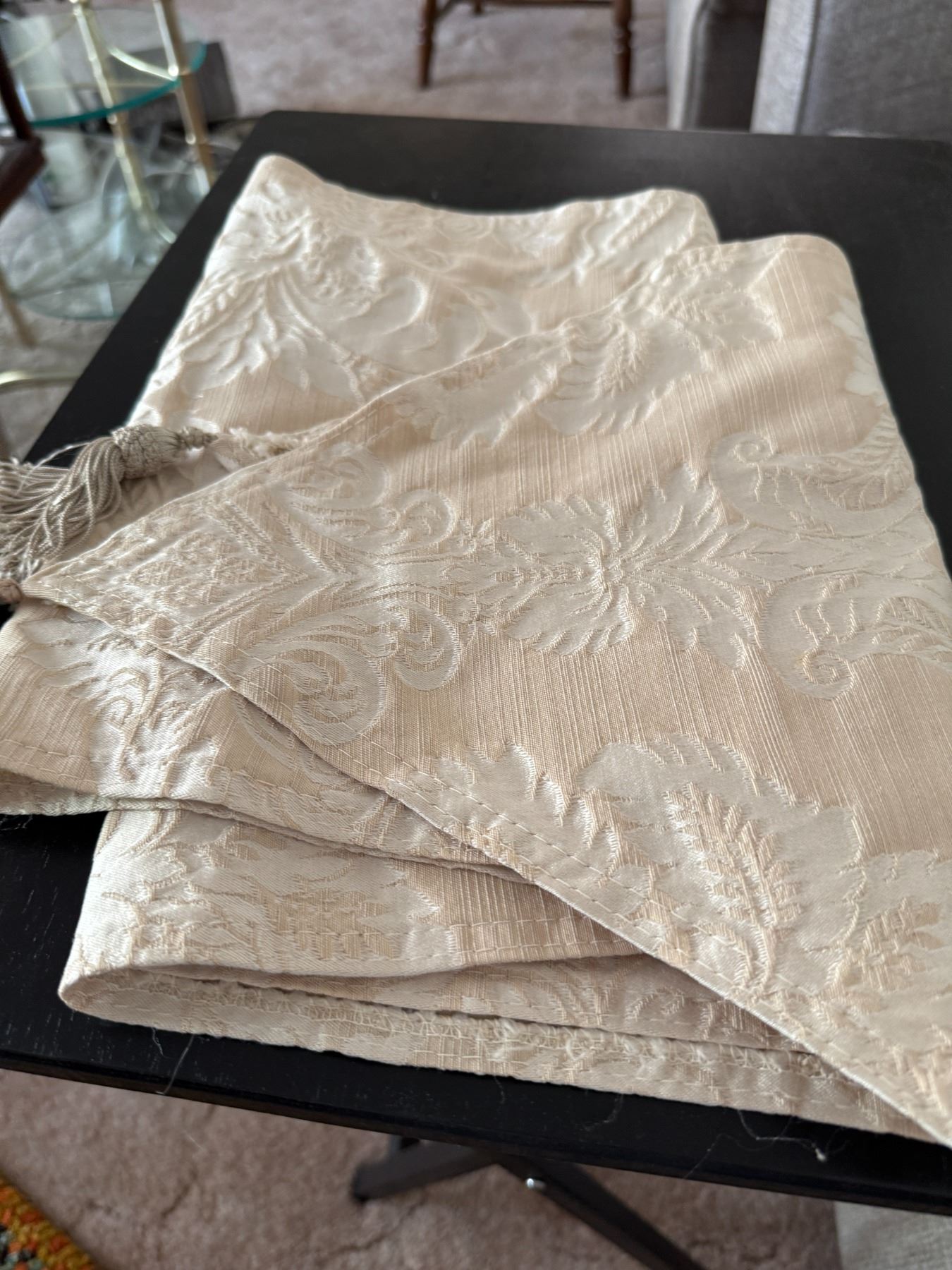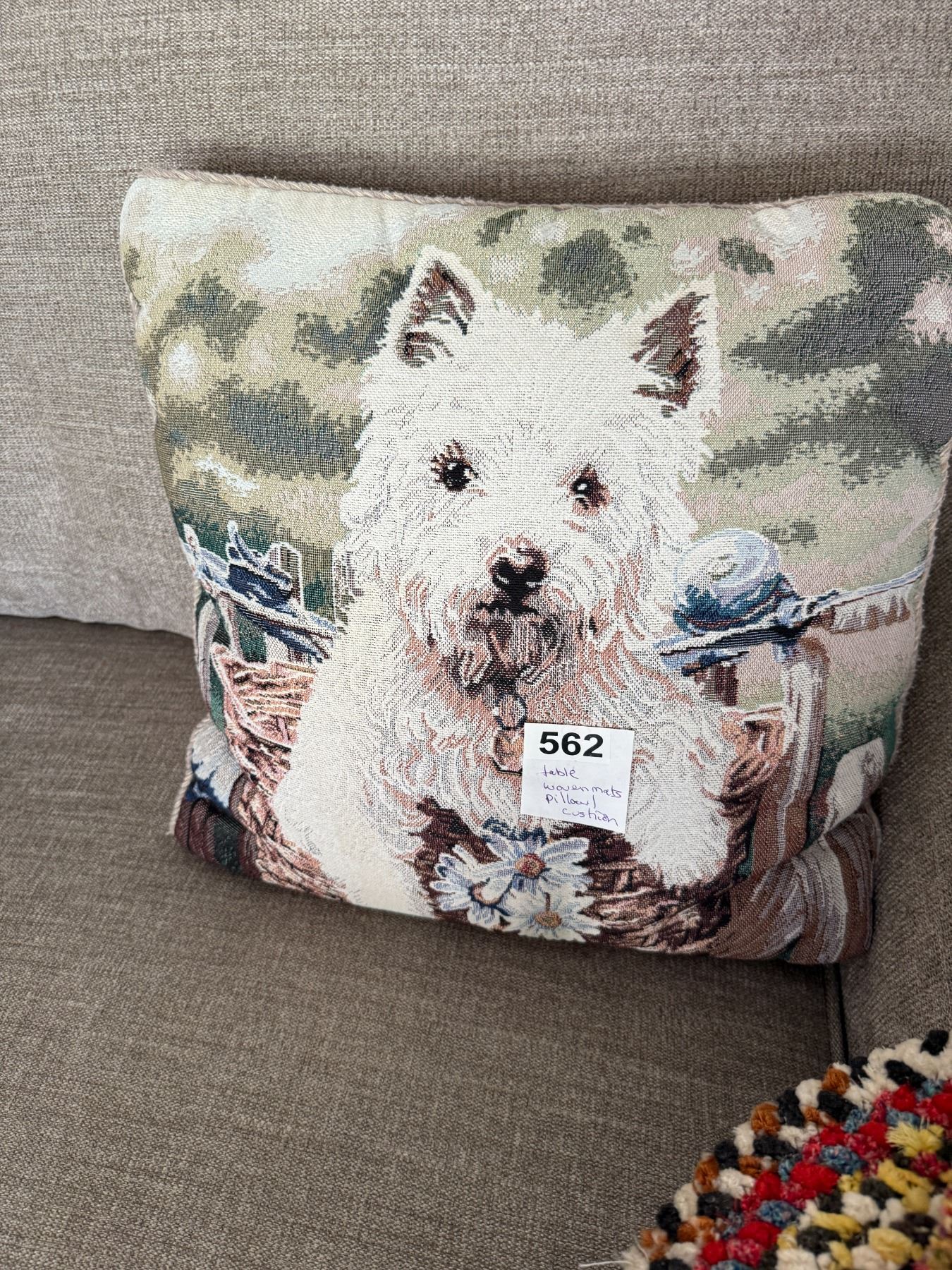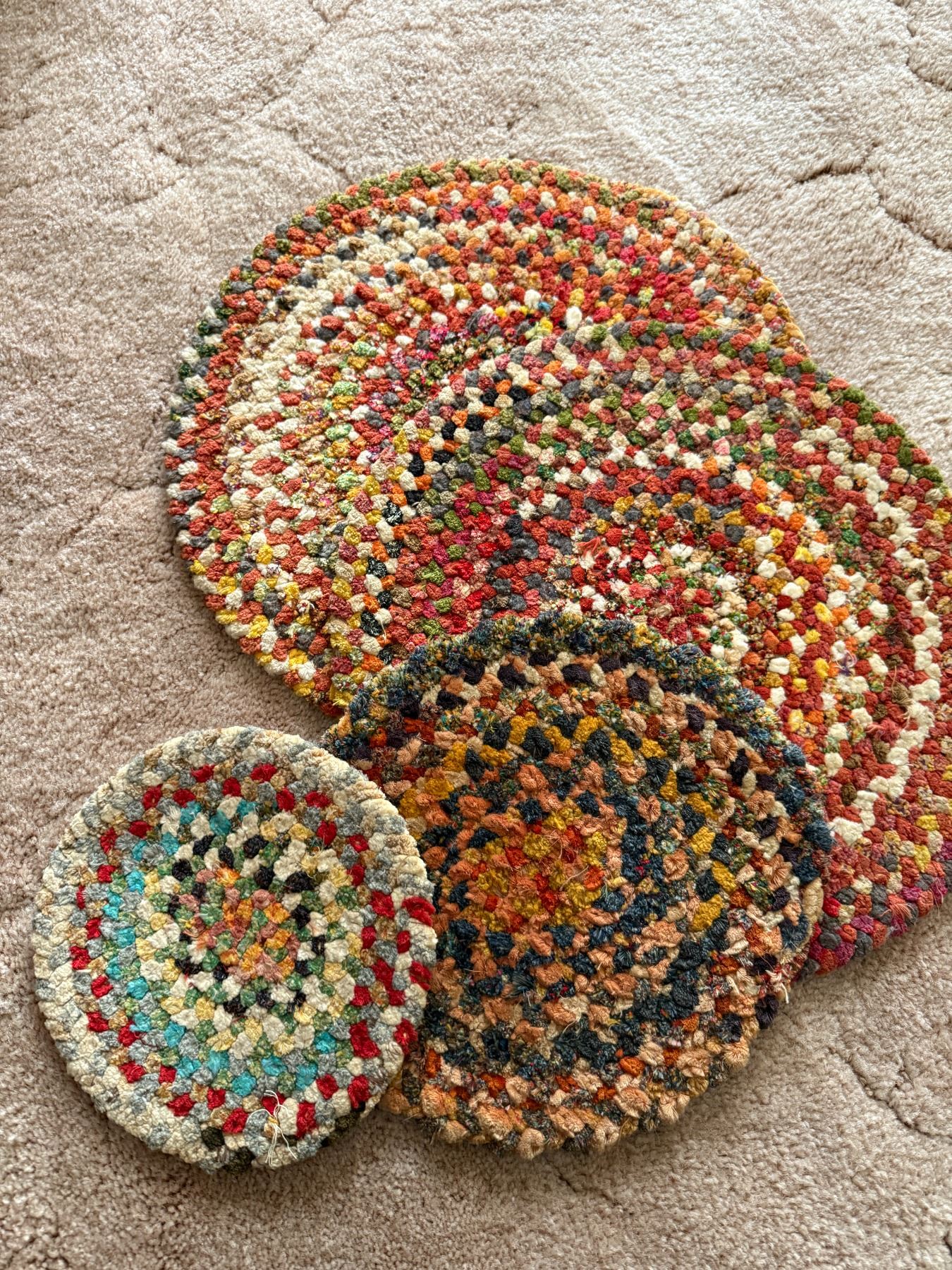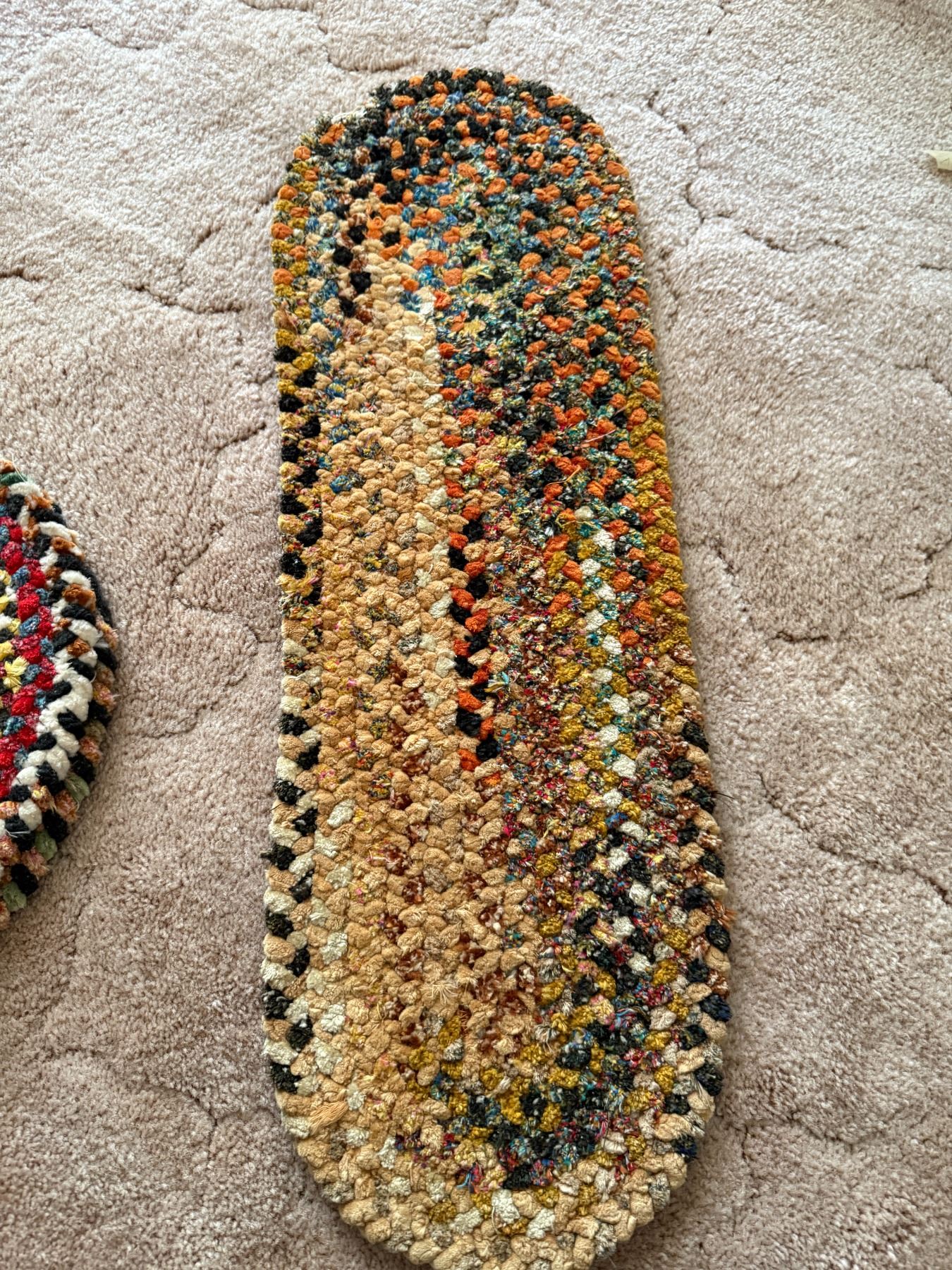 Folding TV tray table, tapestry toss cushion, braided chair and other pads.
