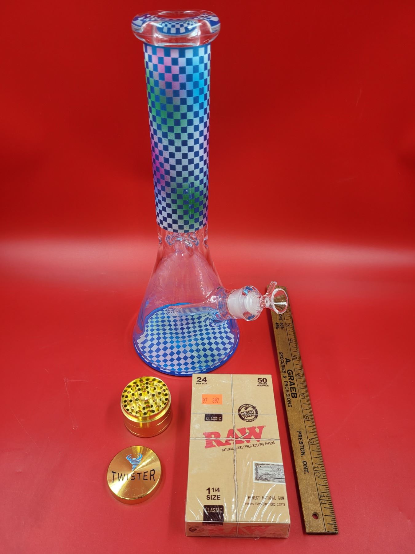 Checkered Bong, Raw Rolling Papers, & Twister Grinder