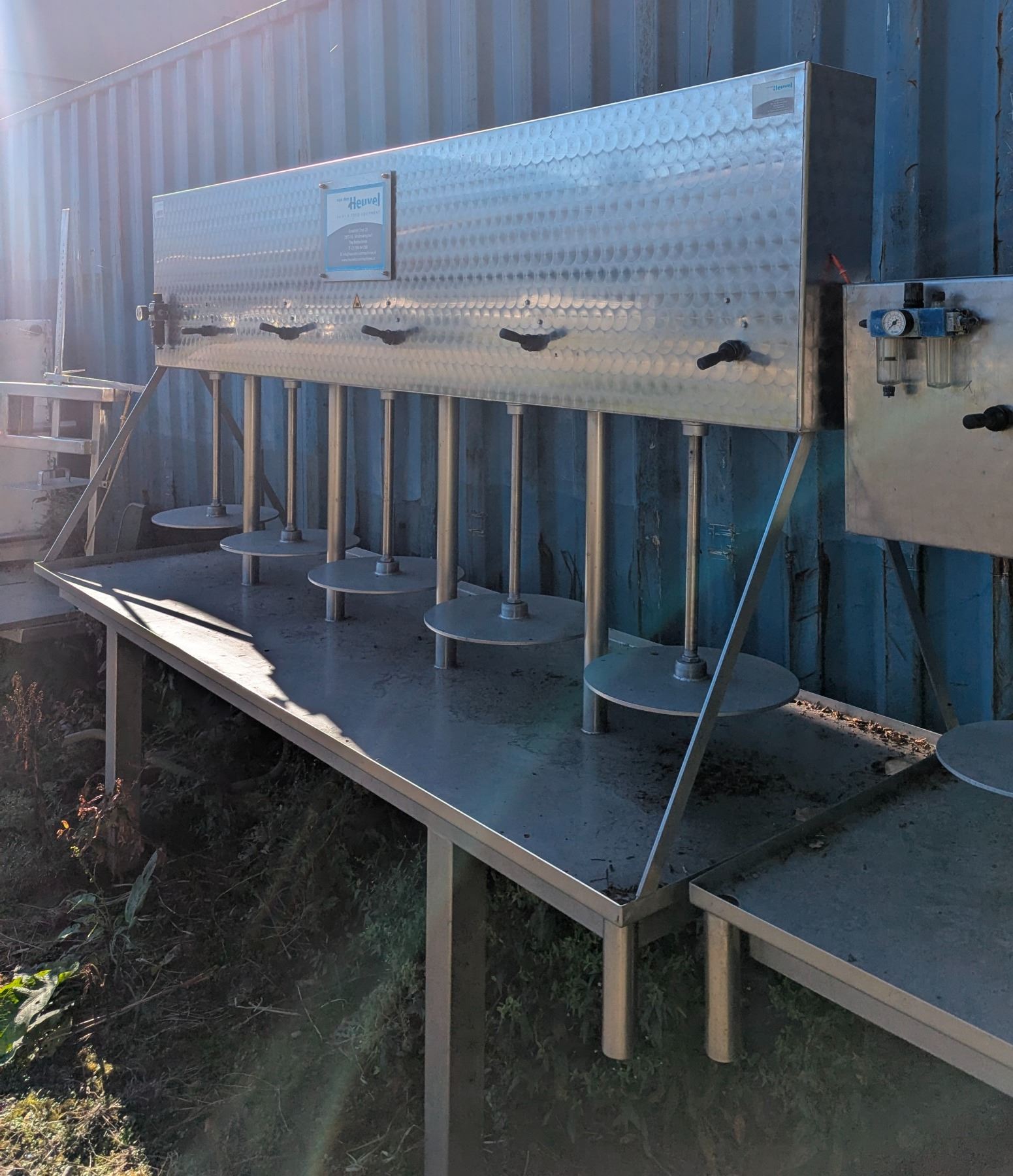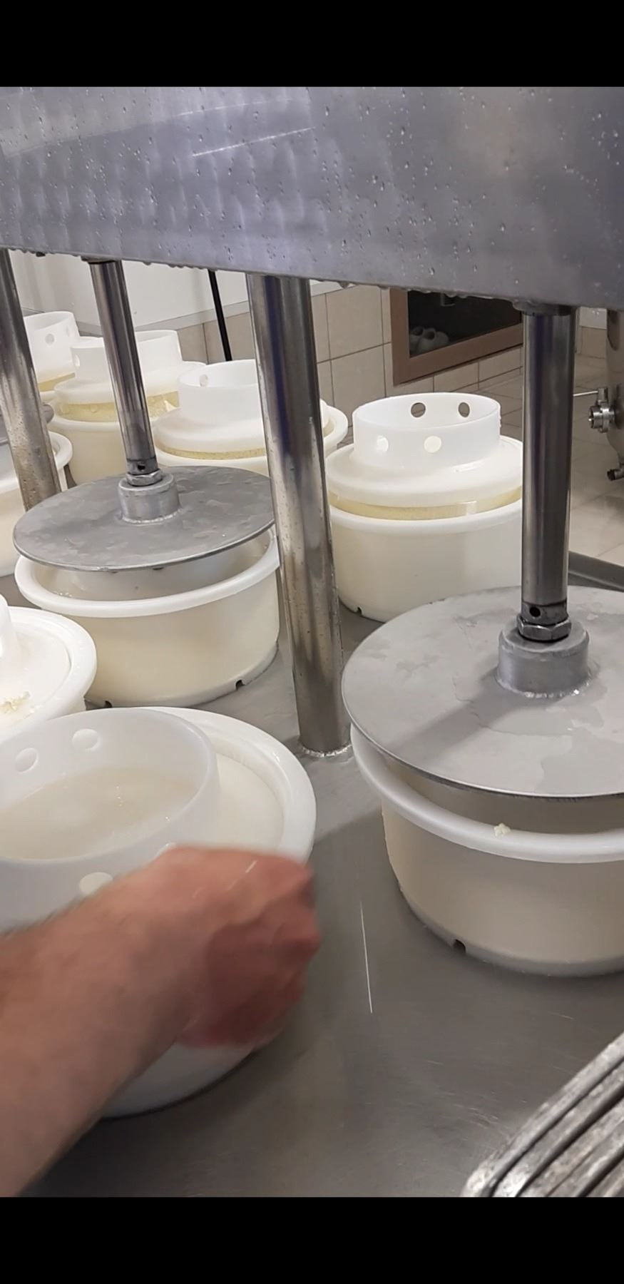 5 ram cheese press. 24 inch under the ram. Can fit three 5 kilo molds or two 8 kilo molds of cheese. Adjustable pressure regulator to adjust pressure on the go. Also come with plates to add a second stack under each ram.