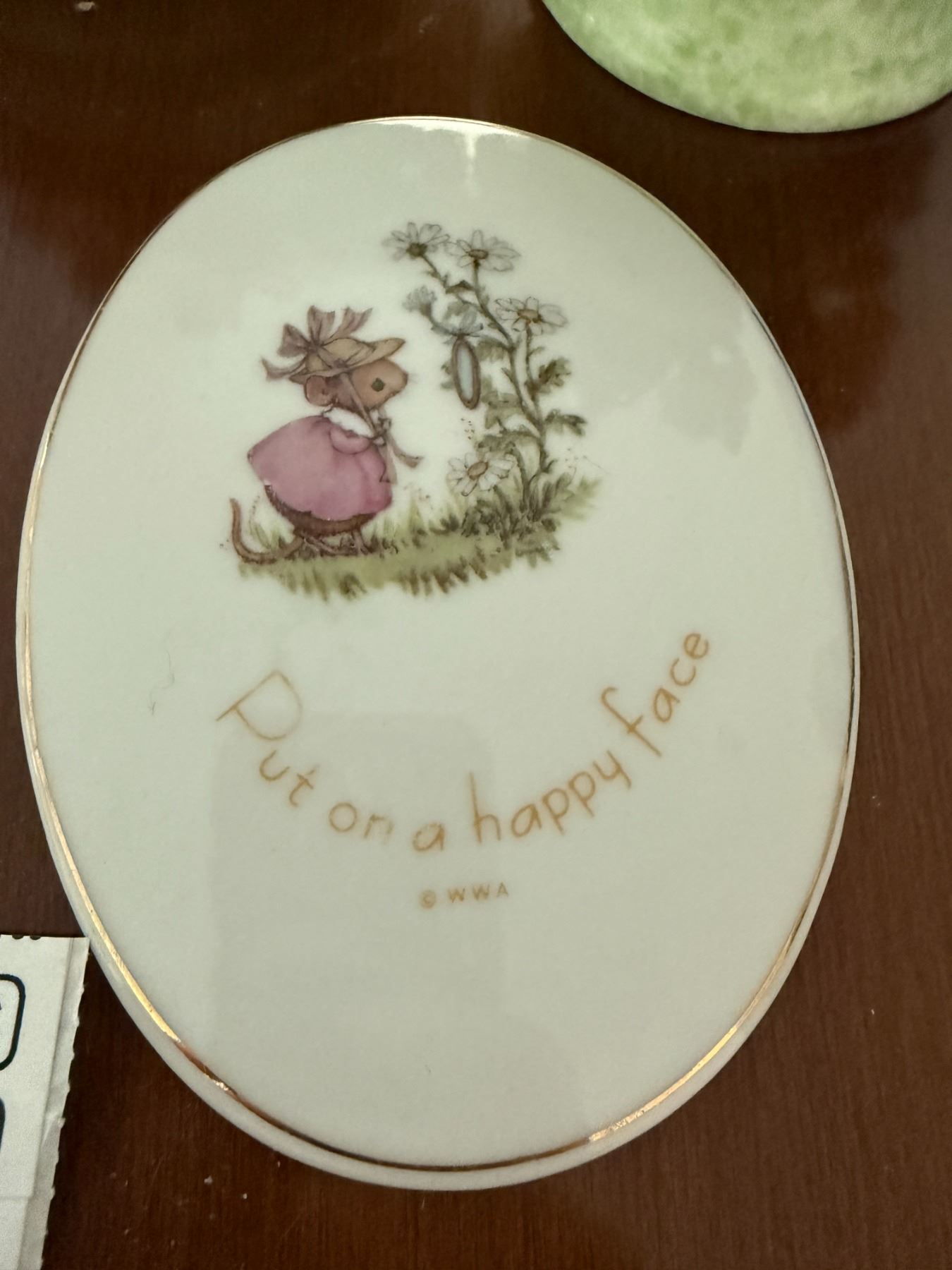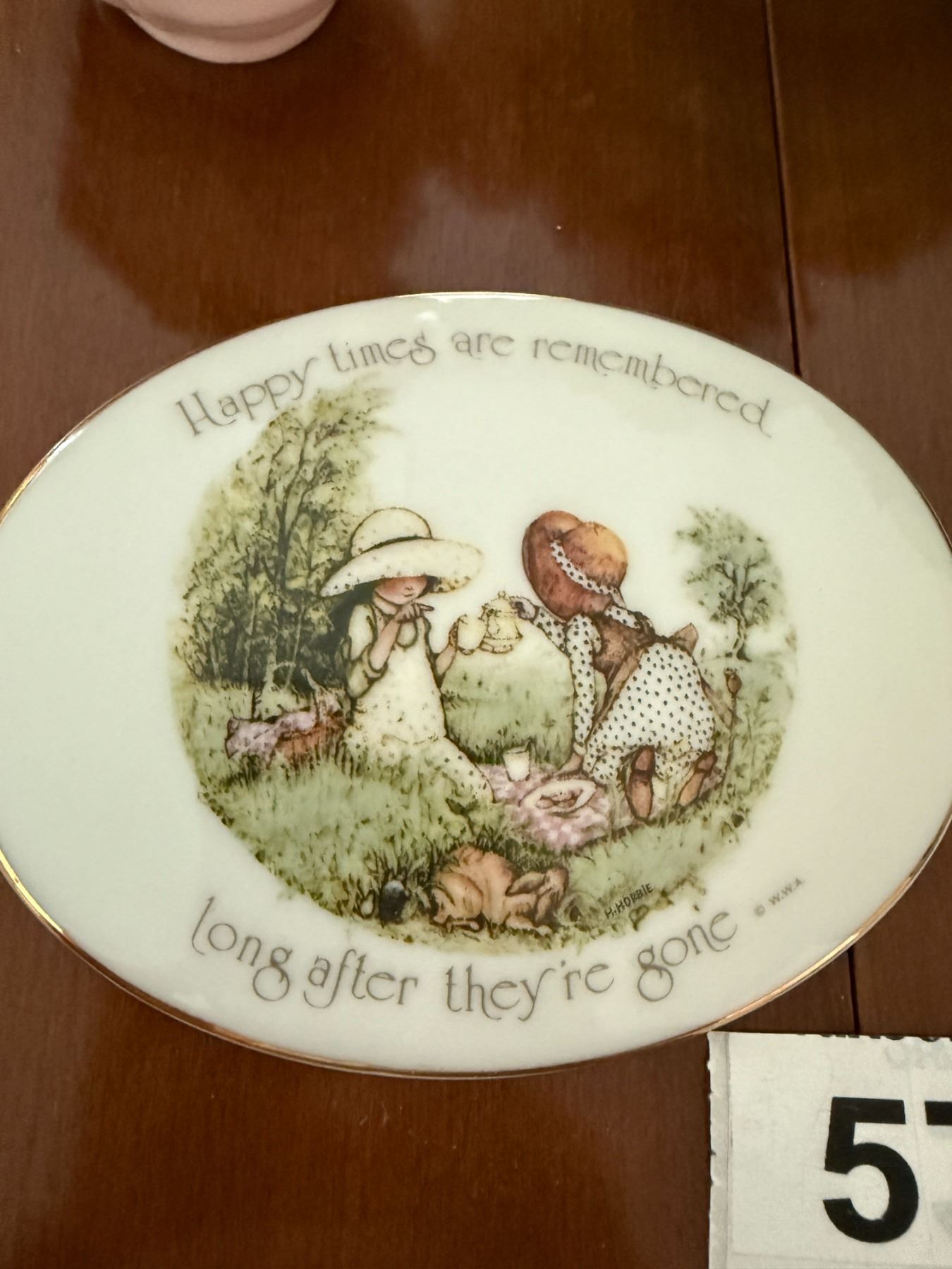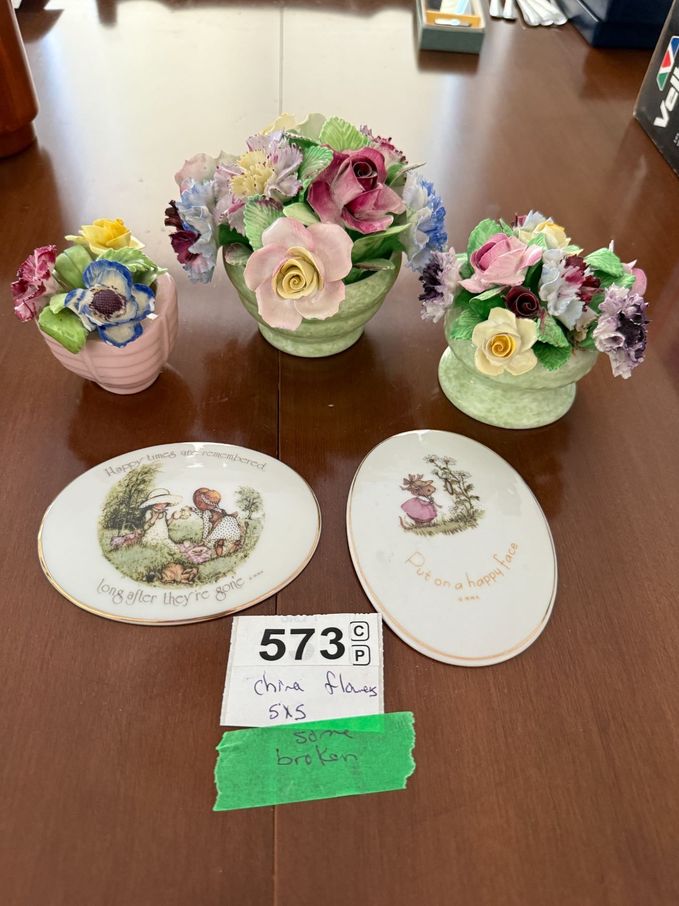 Stafford and Denton china flowers - some damage. 5x5"largest. Holly Hobbie plaques.