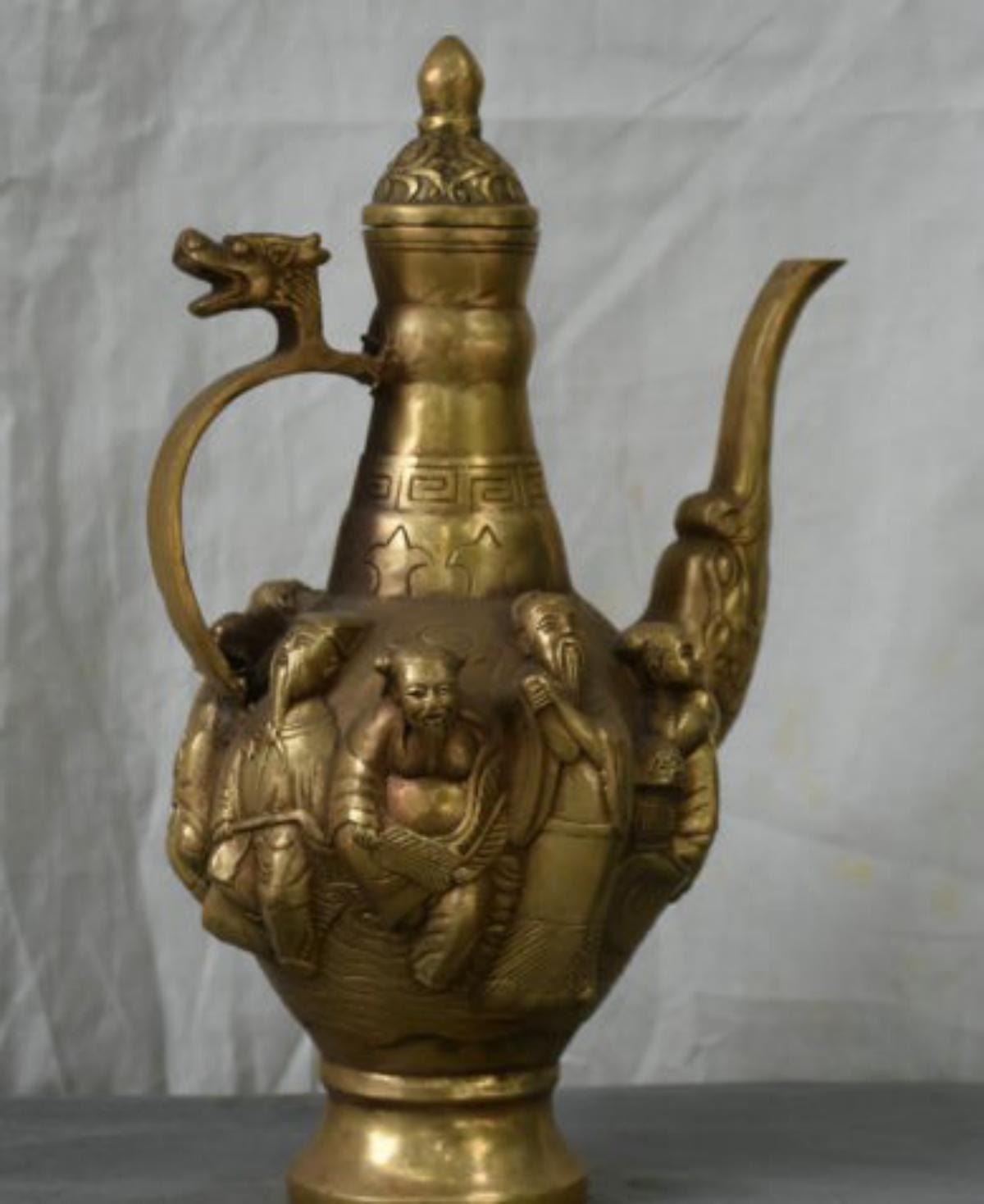 Chinese Brass 8 Immortals Wine Tea/ Wine Pot ; size - High 10.4 Long 6.4 Wide 4.8 (inch)