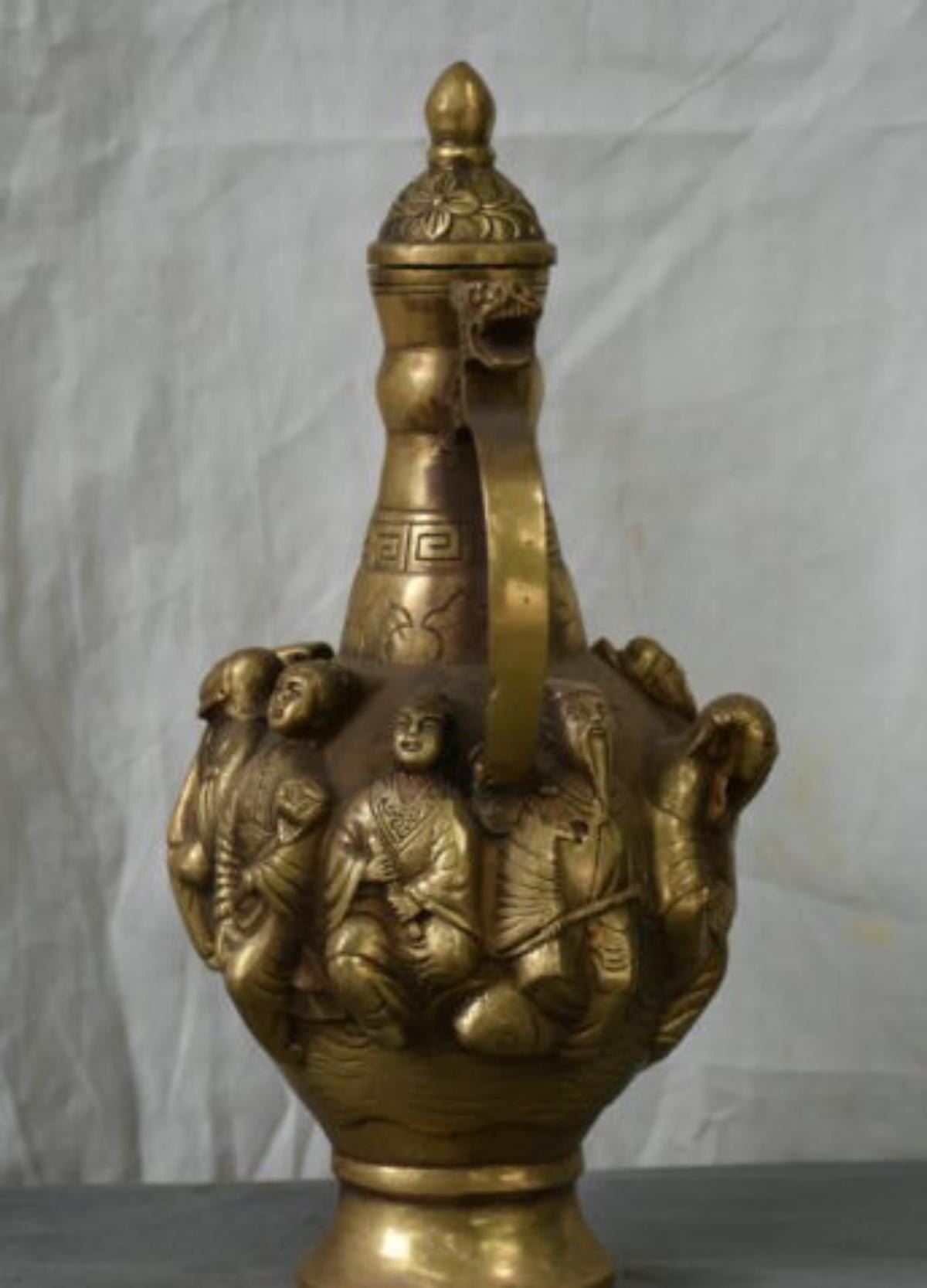 Chinese Brass 8 Immortals Wine Tea/ Wine Pot ; size - High 10.4 Long 6.4 Wide 4.8 (inch)