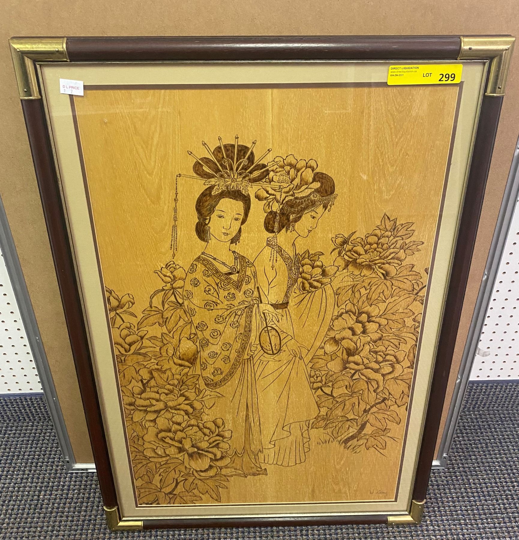 Chinese Woodburn Picture Aristocrate ladies in Garden 26 x 29 in