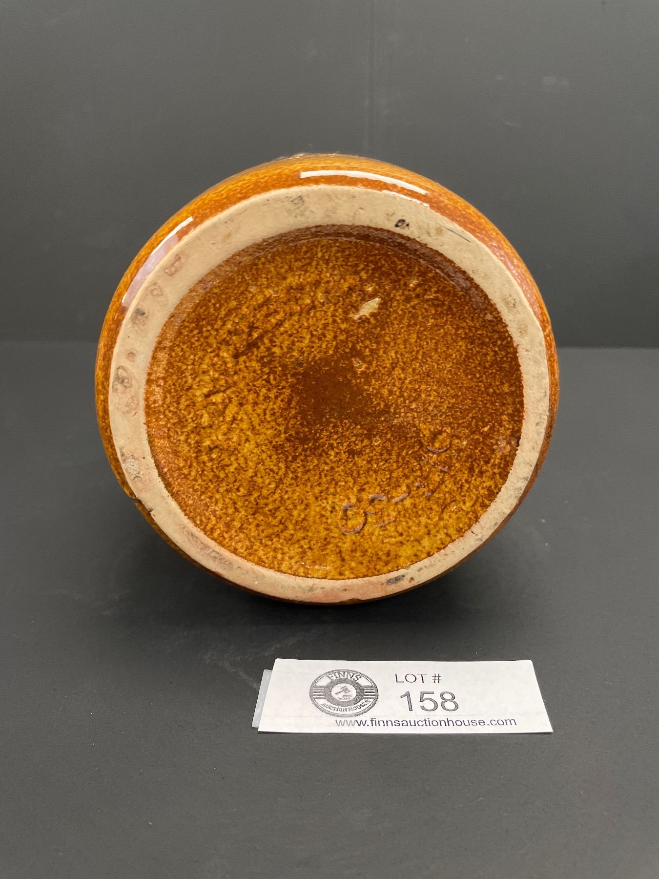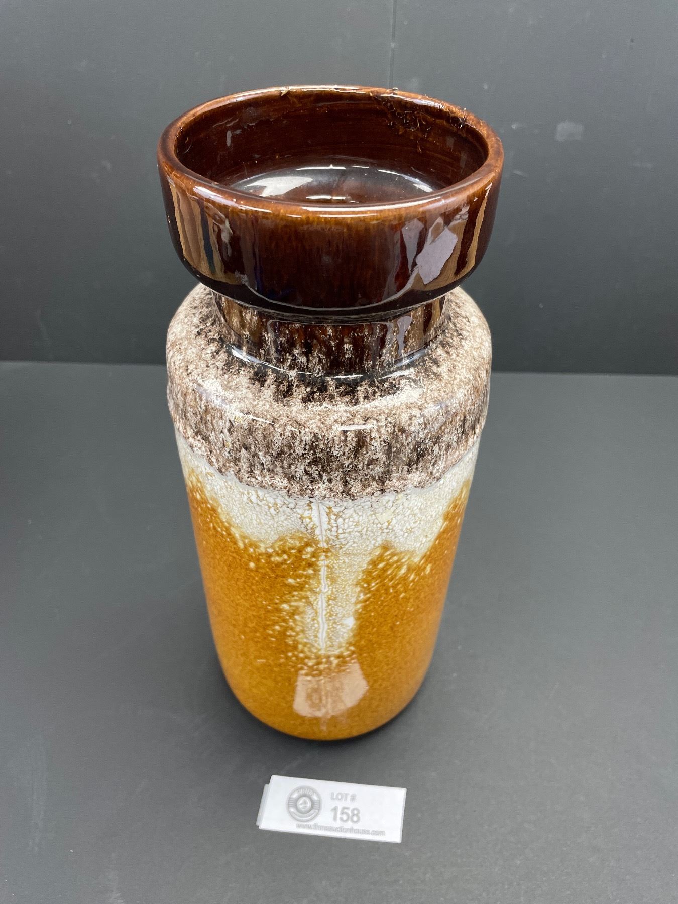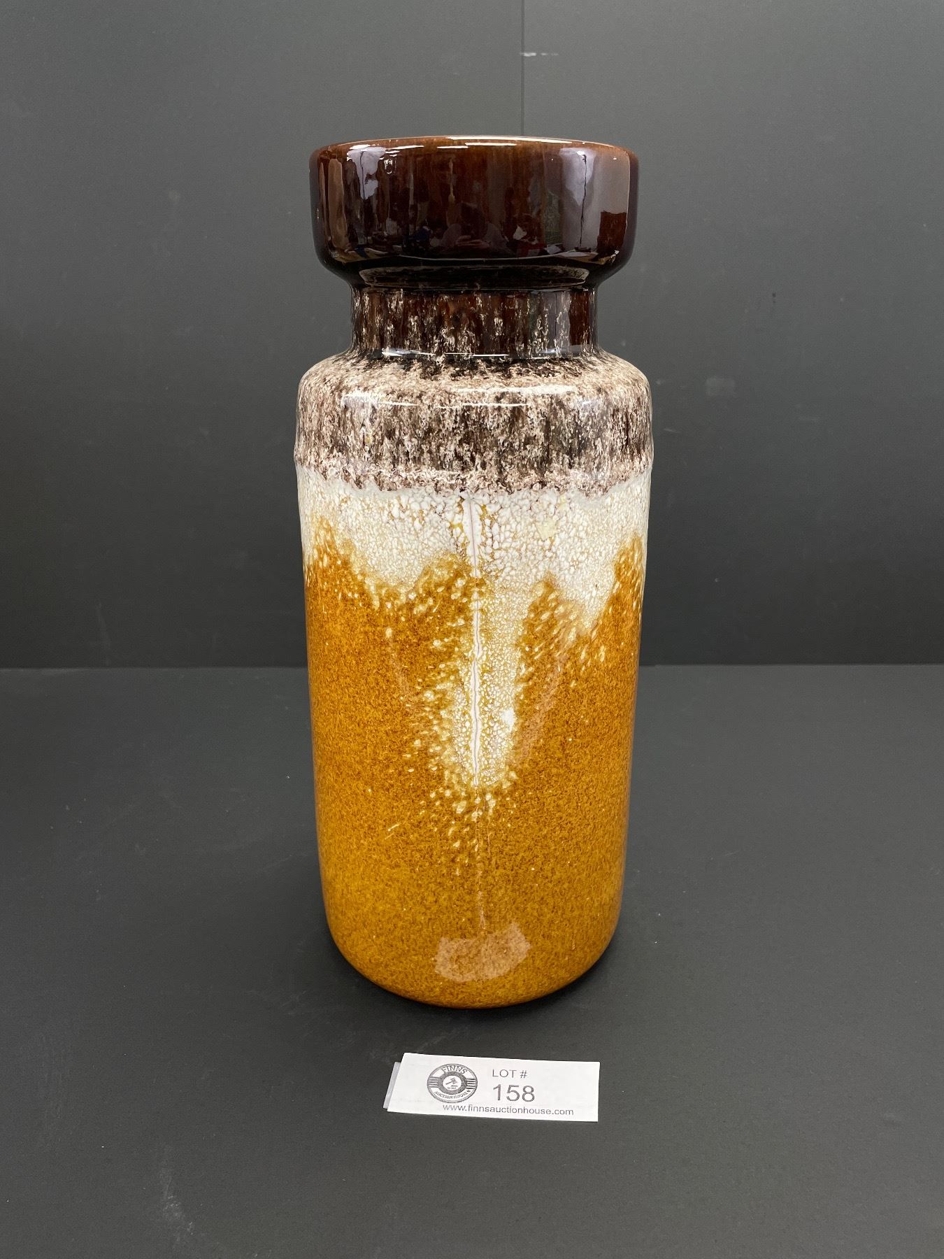 Chocolate Brown Dripping into White Mixing with Caramel MCM West German Vase. Has an Interesting Firing Flaw. 11.75" Tall