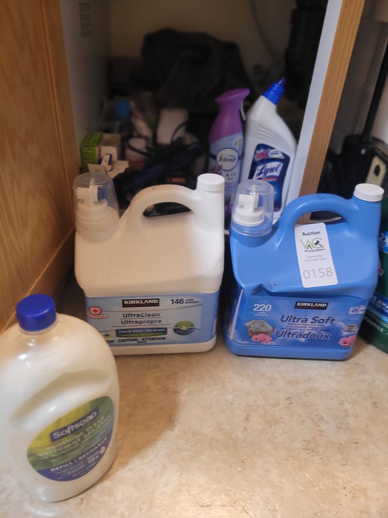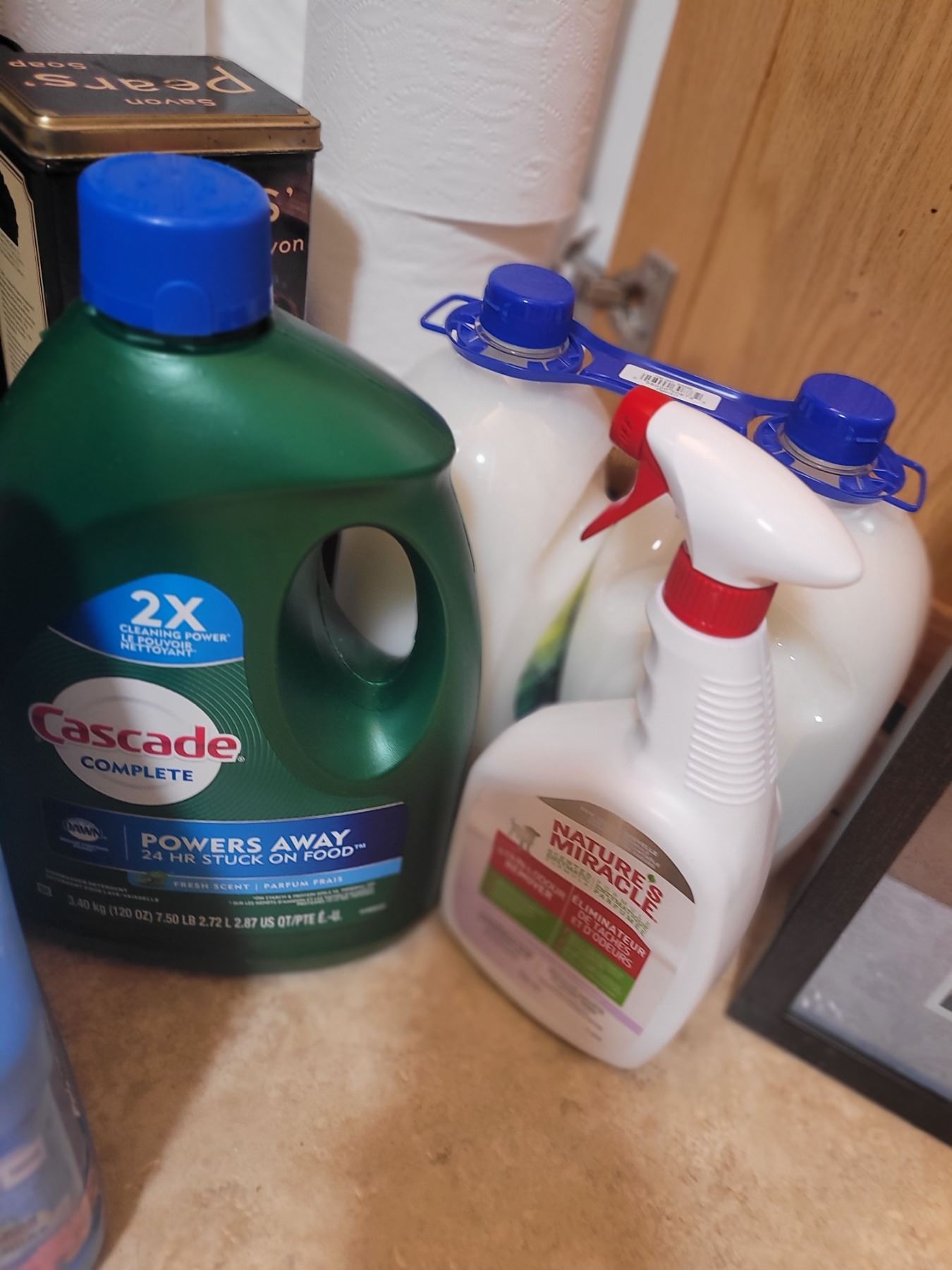 Dishwasher liquid, fabric softener, toilet paper, Wahl razor kit, laundry soap. Pick up 9-10