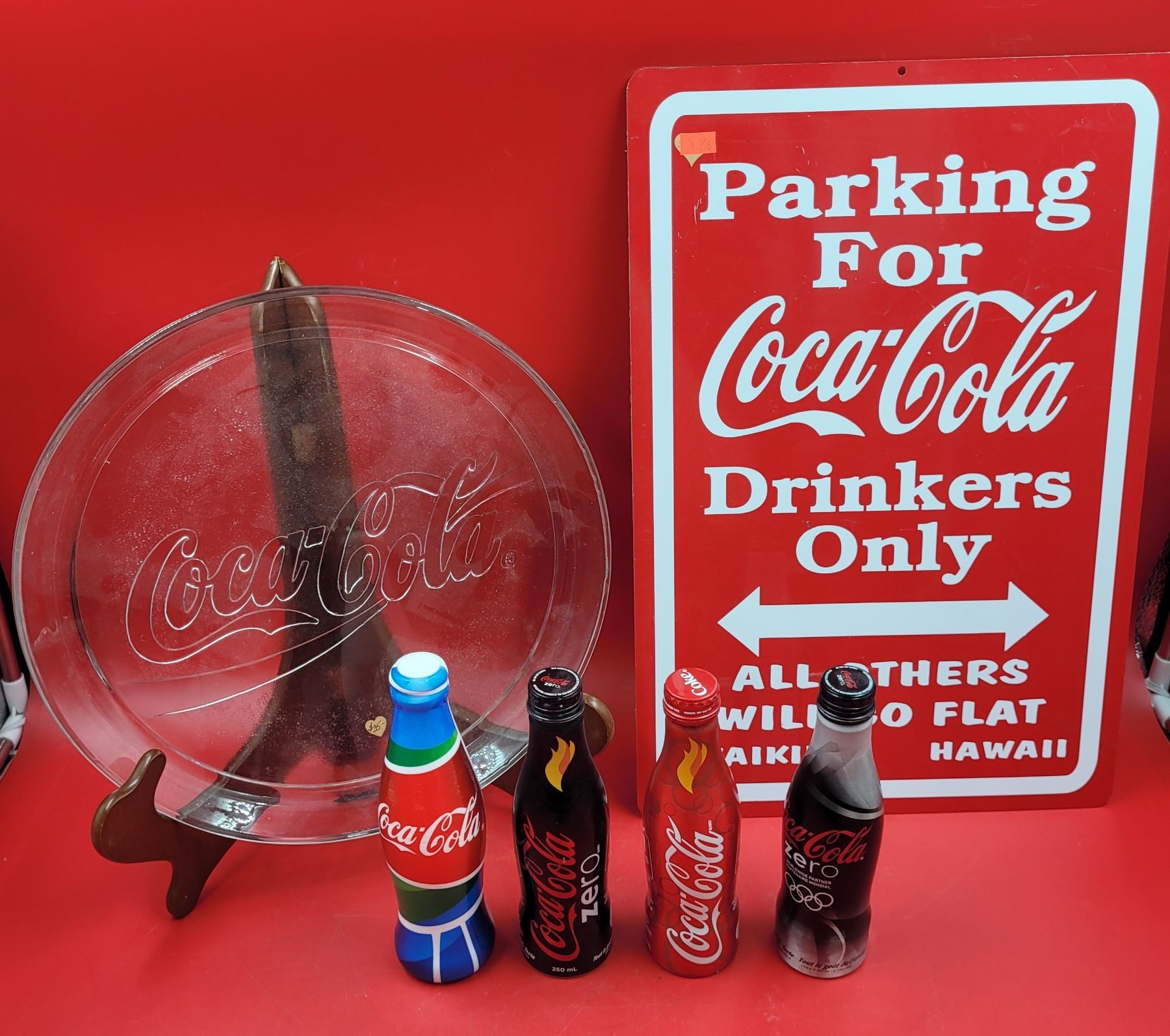 Coca-Cola Parking Sign, Glass Plate & Tin Bottles