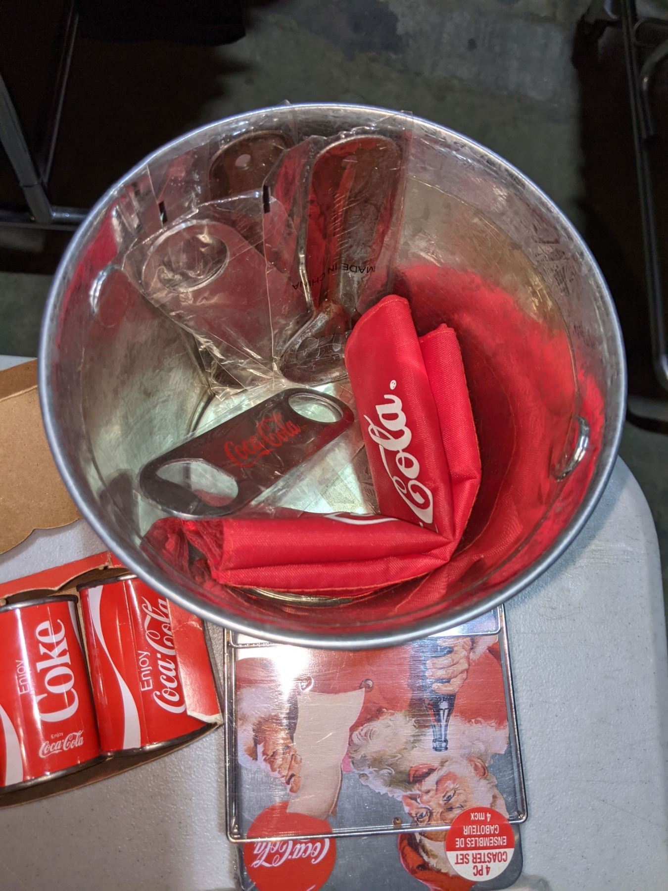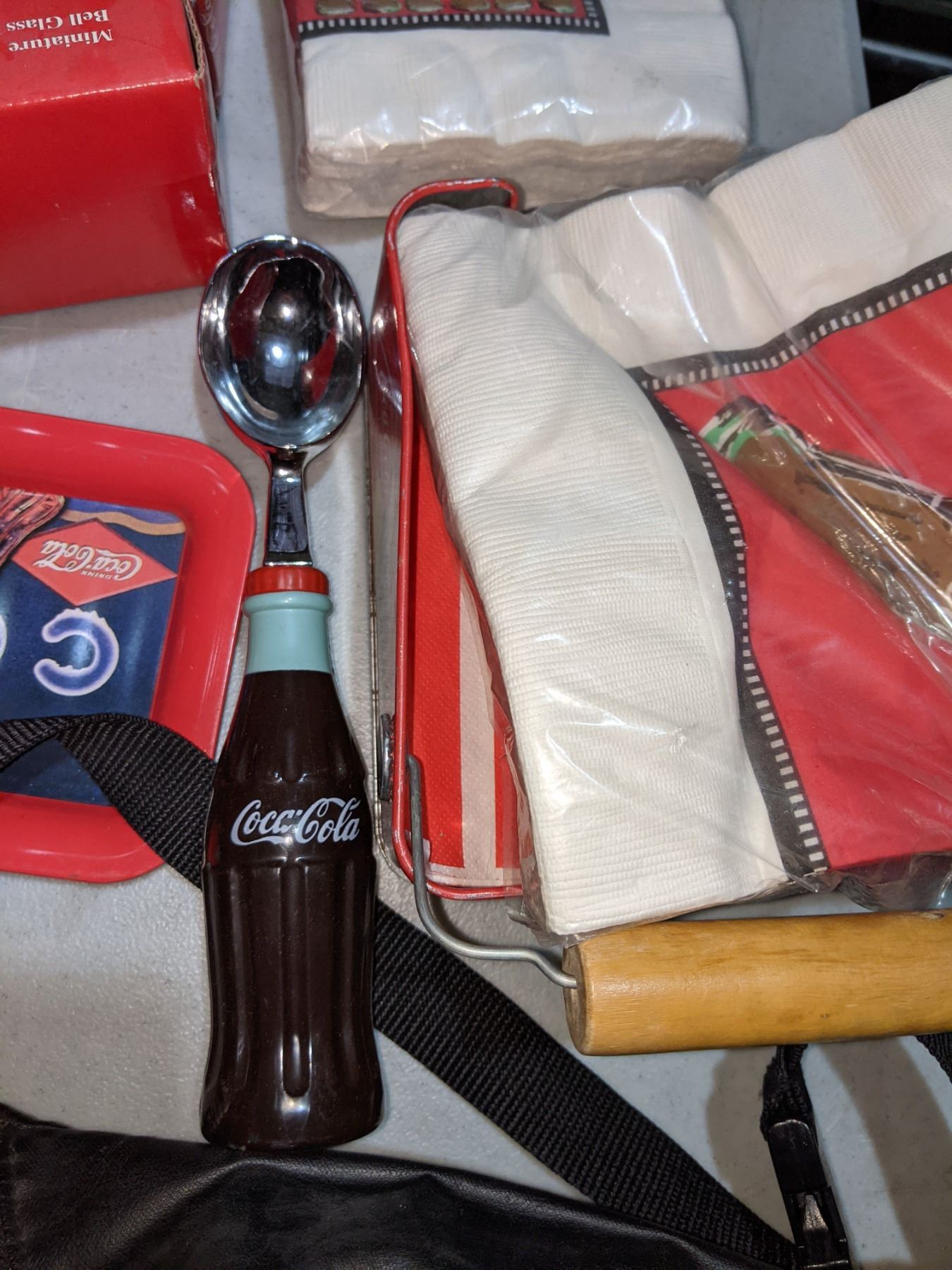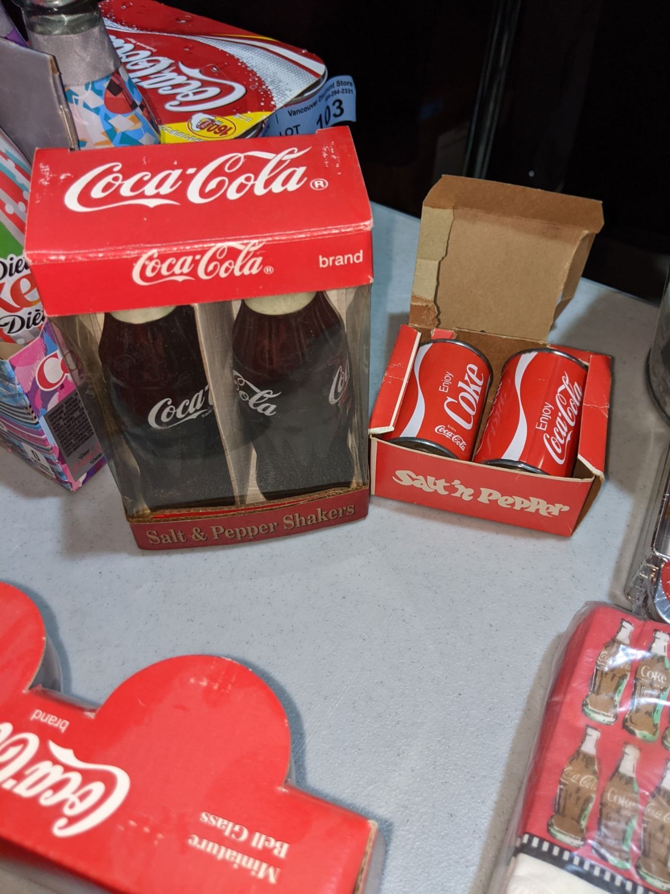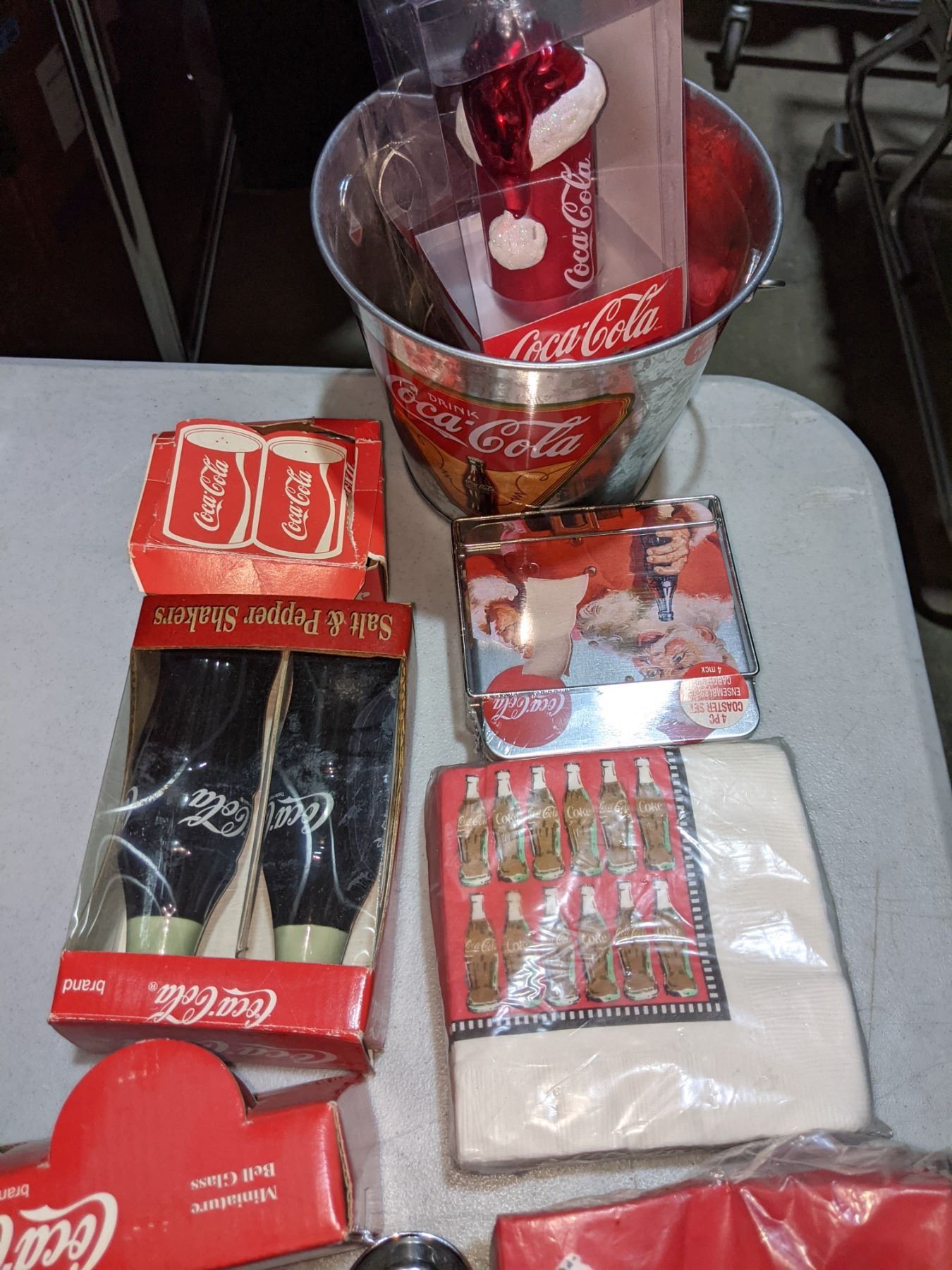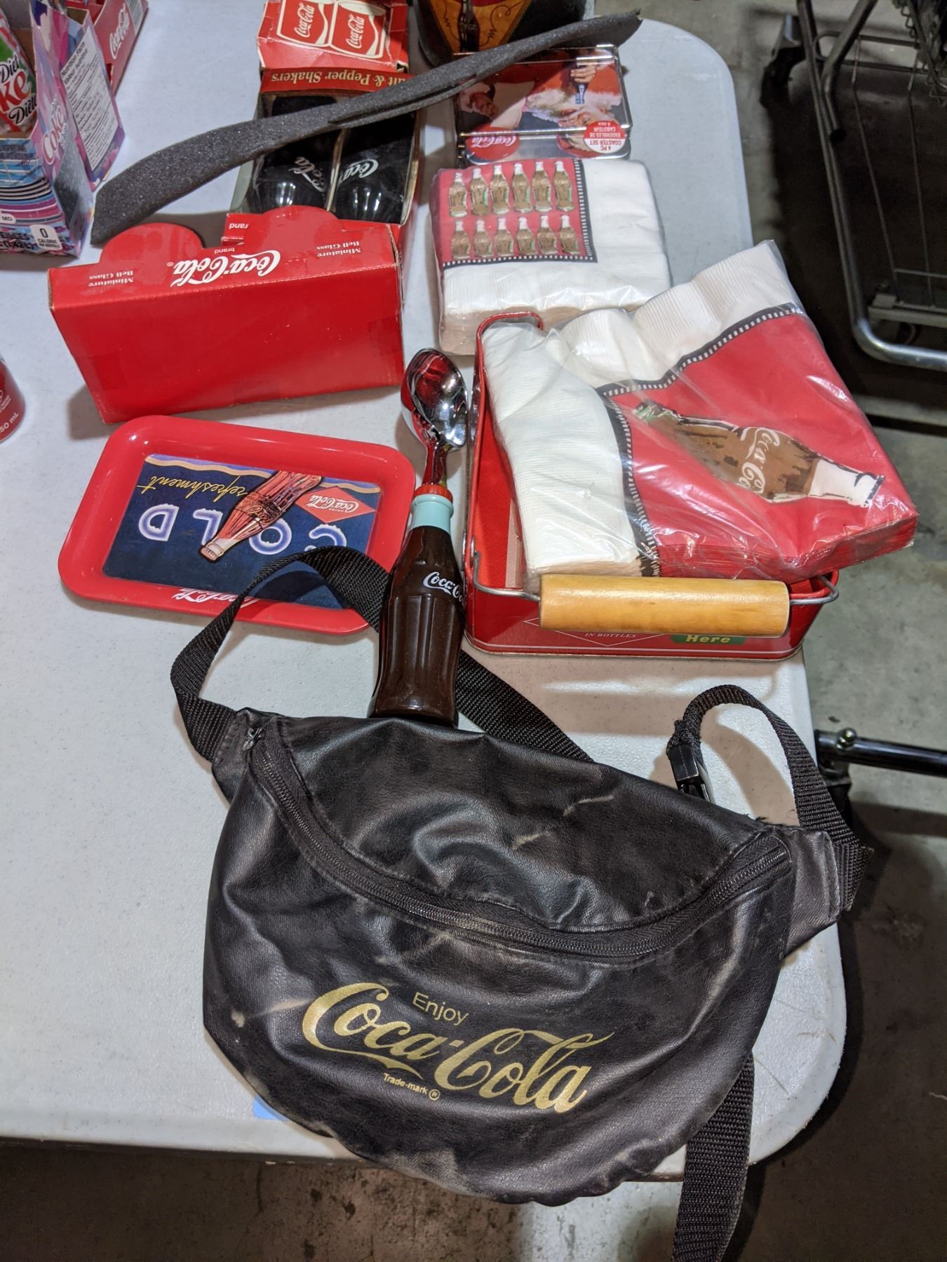 Coca-Cola fanny pack and miscellaneous Coca-Cola items, napkins, Christmas decor, salt and pepper sh