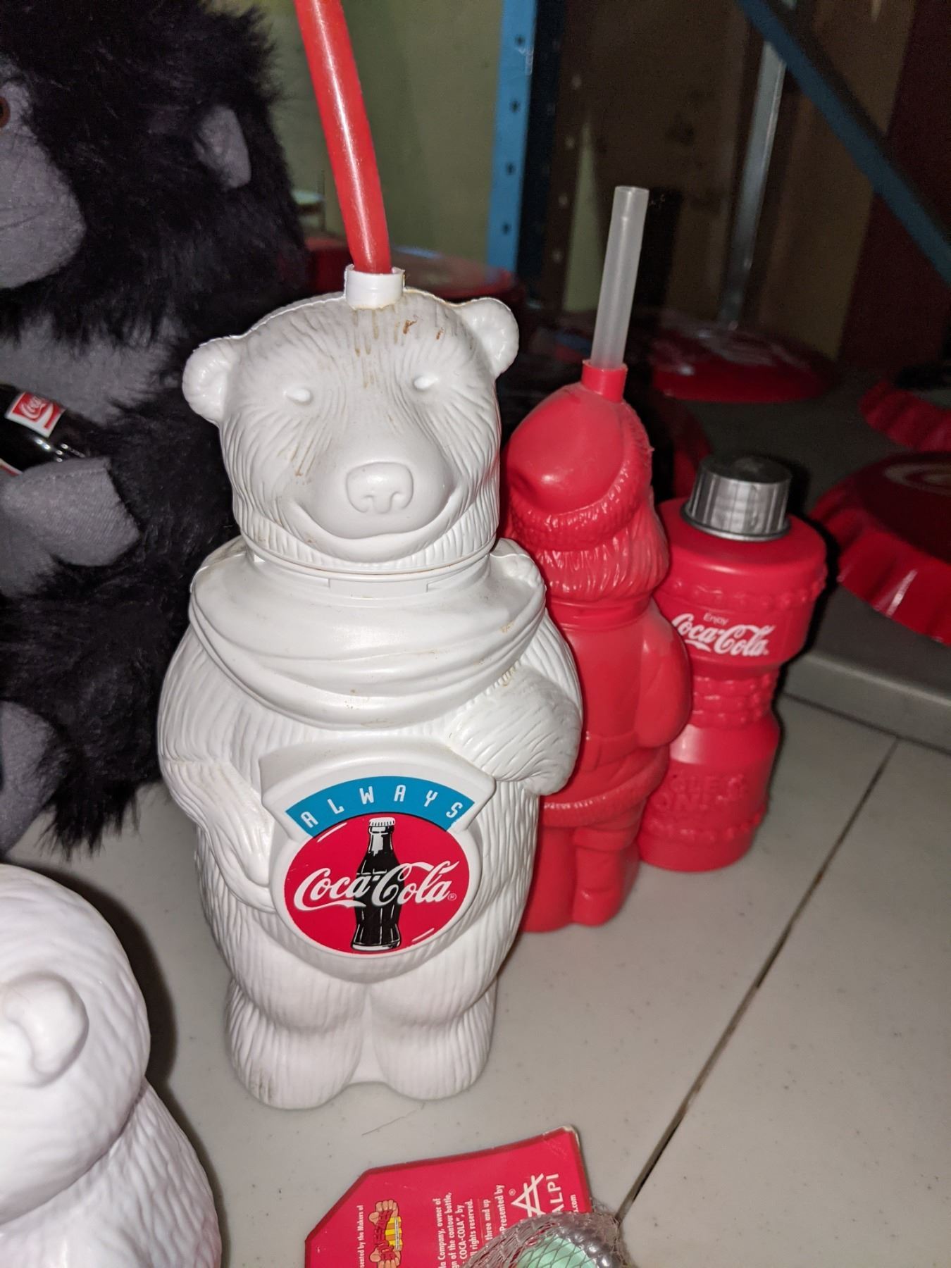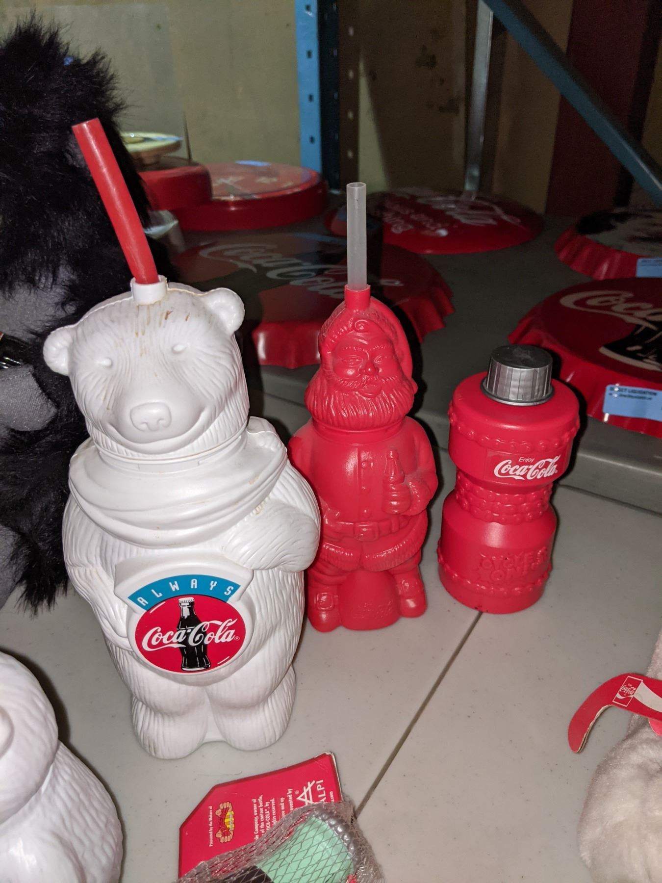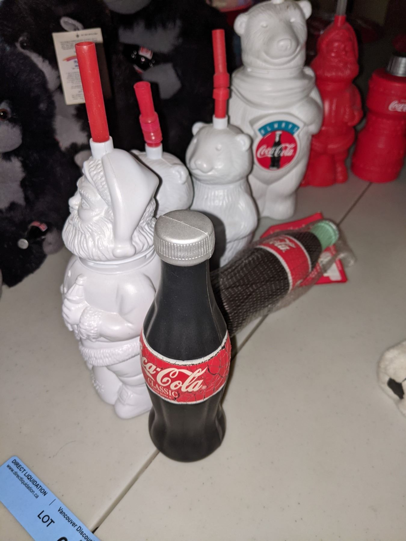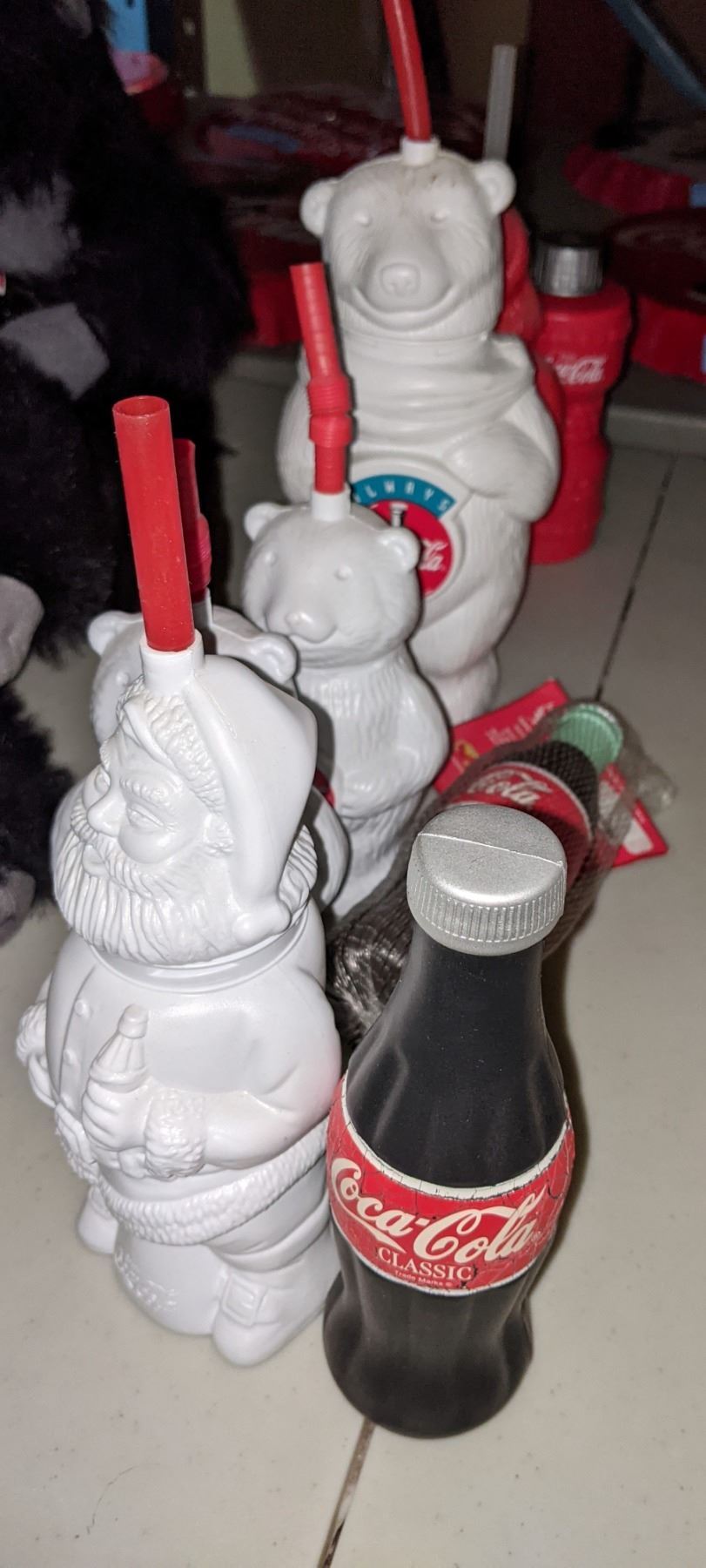 Coke icy promo cups, Santa Claus polar bear, two rubber Coca-Cola bottles etc.