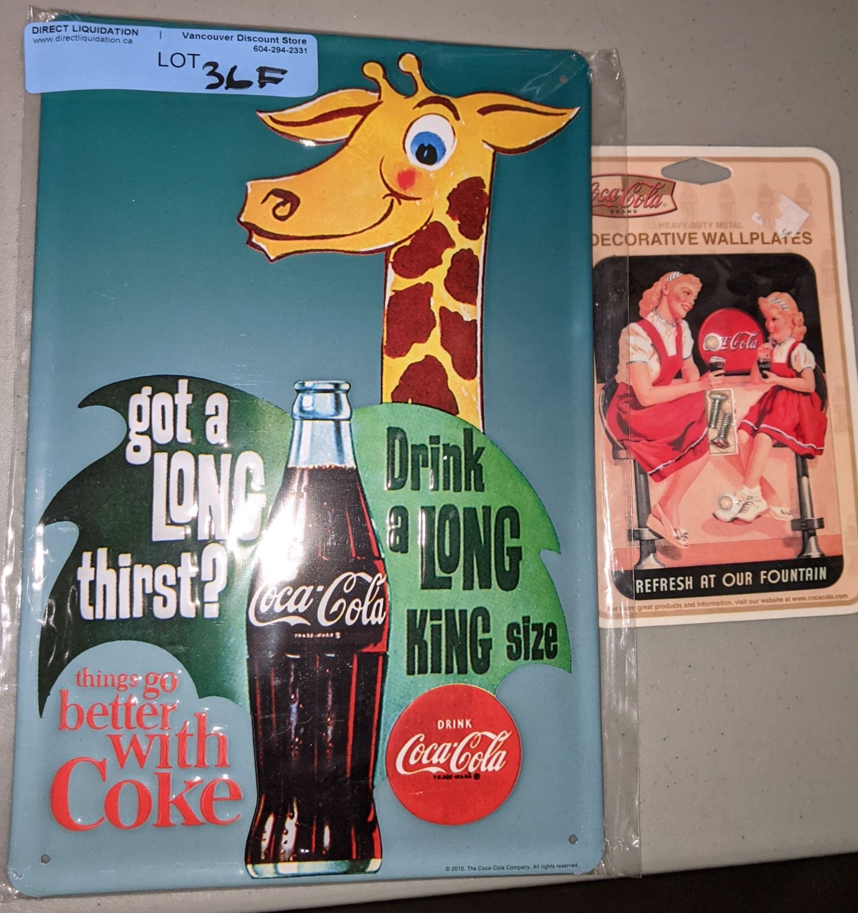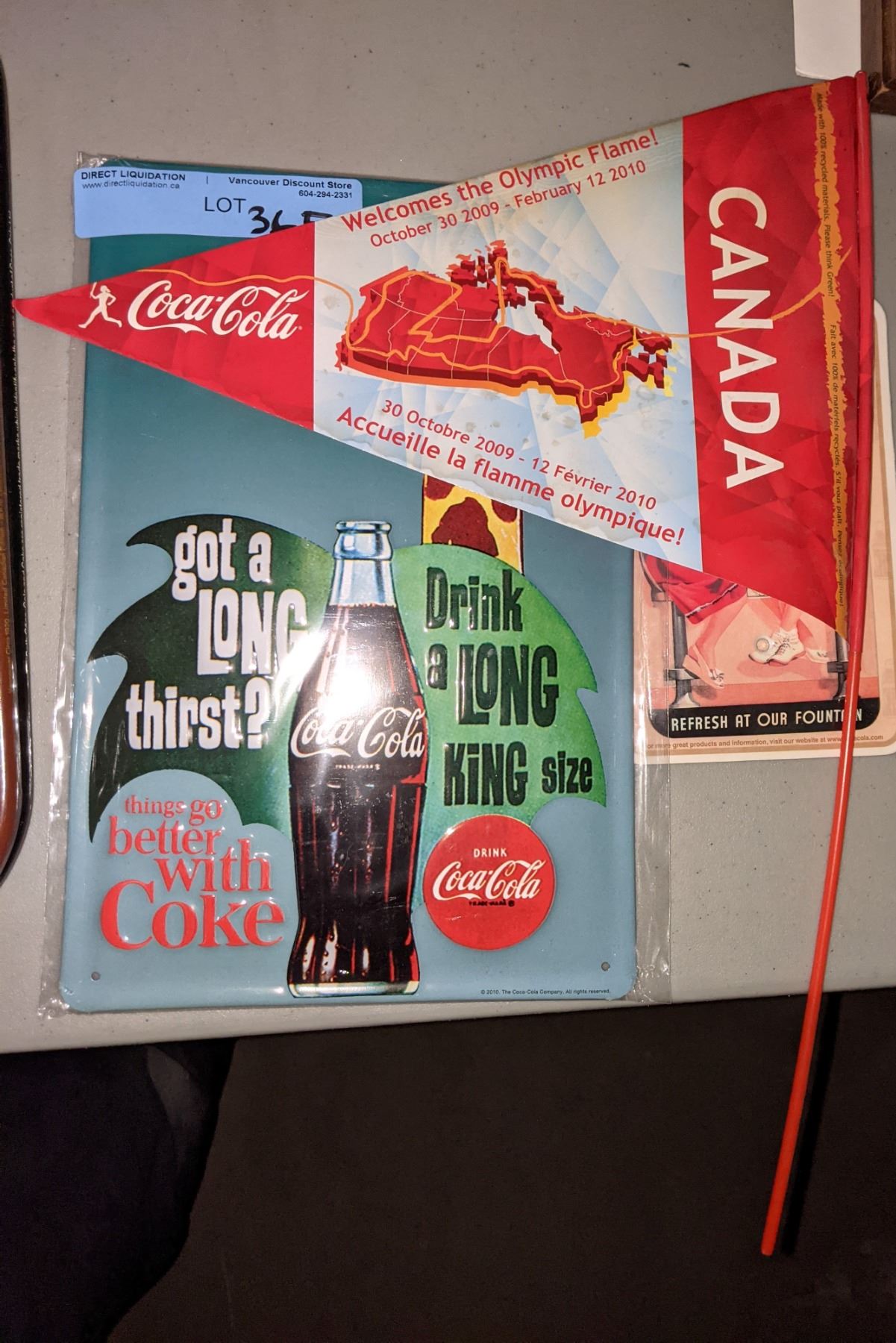 Coke metal sign, decorative wall plate and 2009 Olympic flag