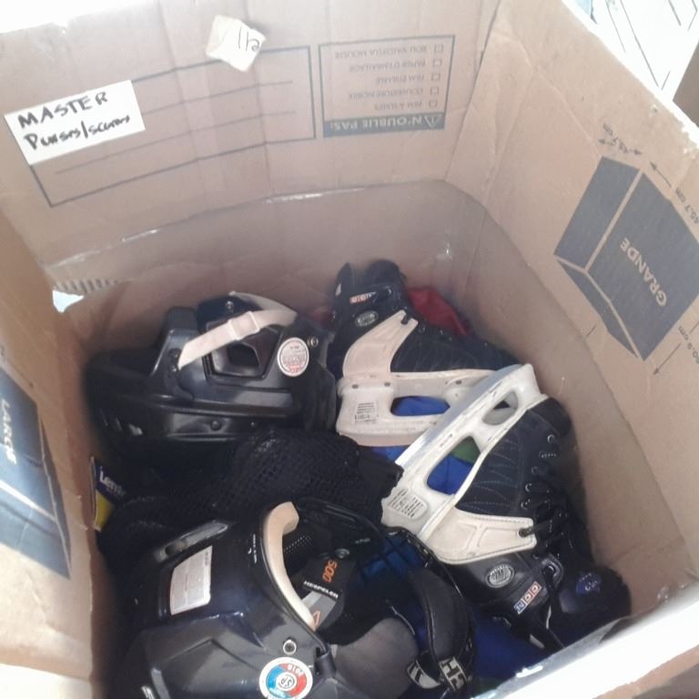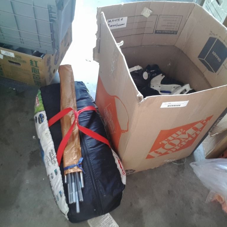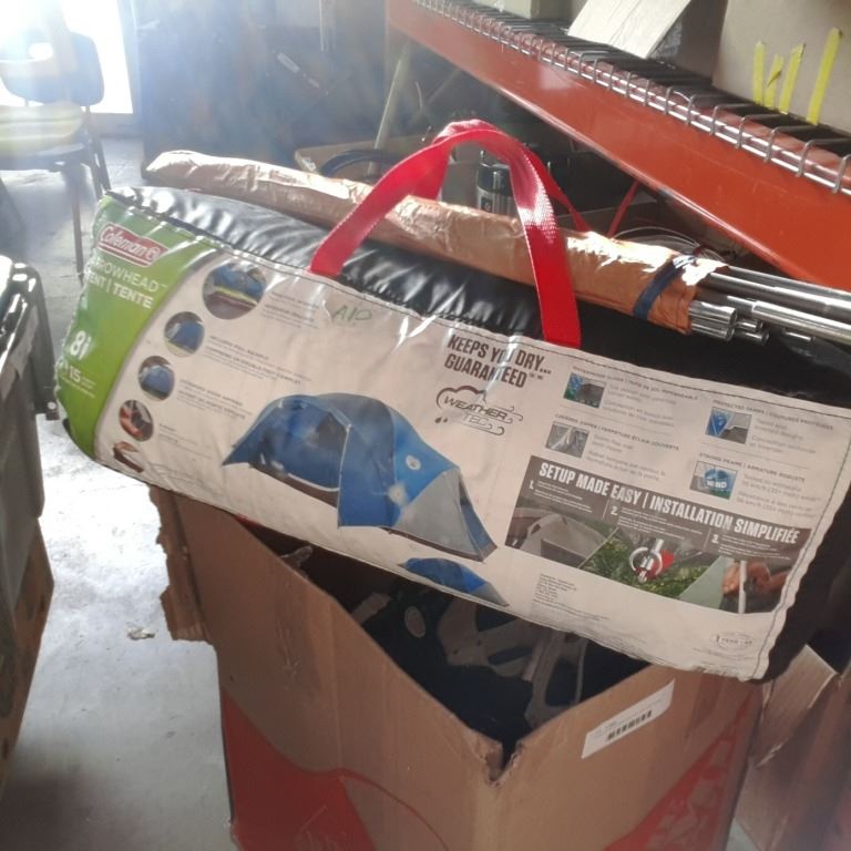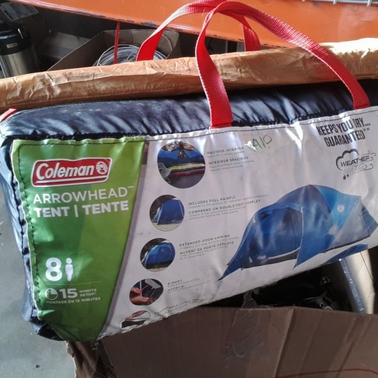 Coleman arrowhead 8 person tent with hockey skates, gear and backpacks
